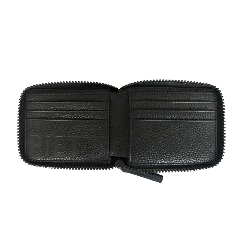 Billetera clásica tipo dollar, de formato plano y plegable con cierre perimetral de cadena plástica ancha. Pertenece a la colección ‘Bold Black’. Realizada en cuero vacuno graneado. Tiene un compartimento interno forrado para billetes, 8 espacios para guardado de tarjetas y el gran adicional del bloqueo RFID para mantener la seguridad de tus tarjetas contactless. Logo PIET grabado en bajo relieve en el interior.