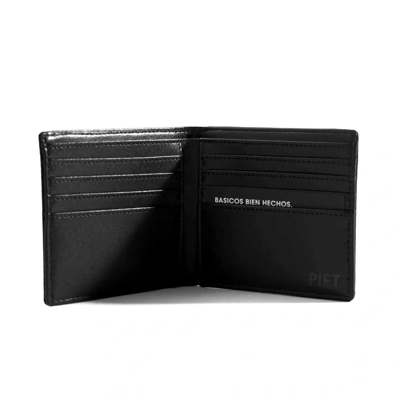 Billetera de formato clásico tipo dólar. Su exterior es de tejido técnico y su interior de PU. Y logo de PIET grabado en bajo relieve metalico.