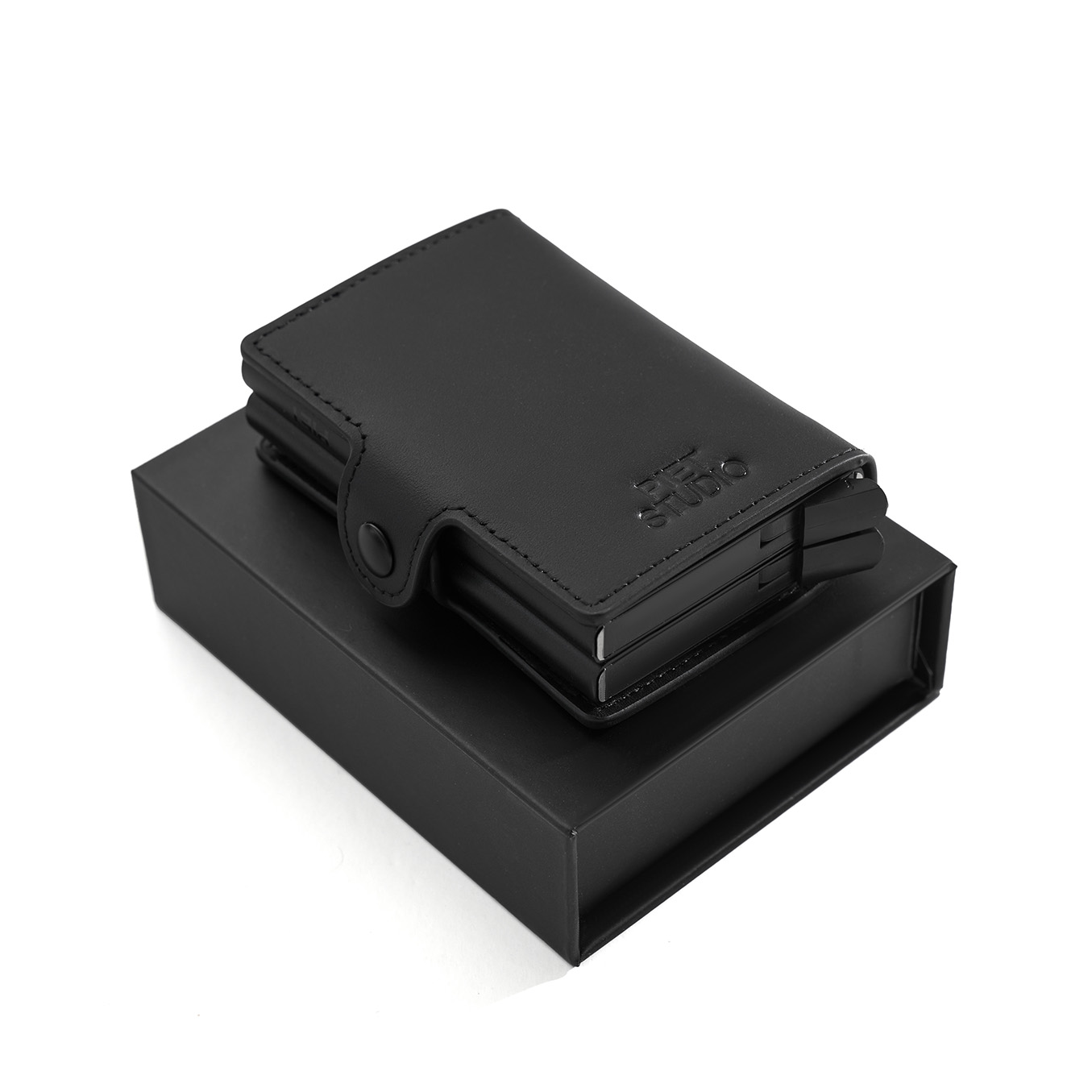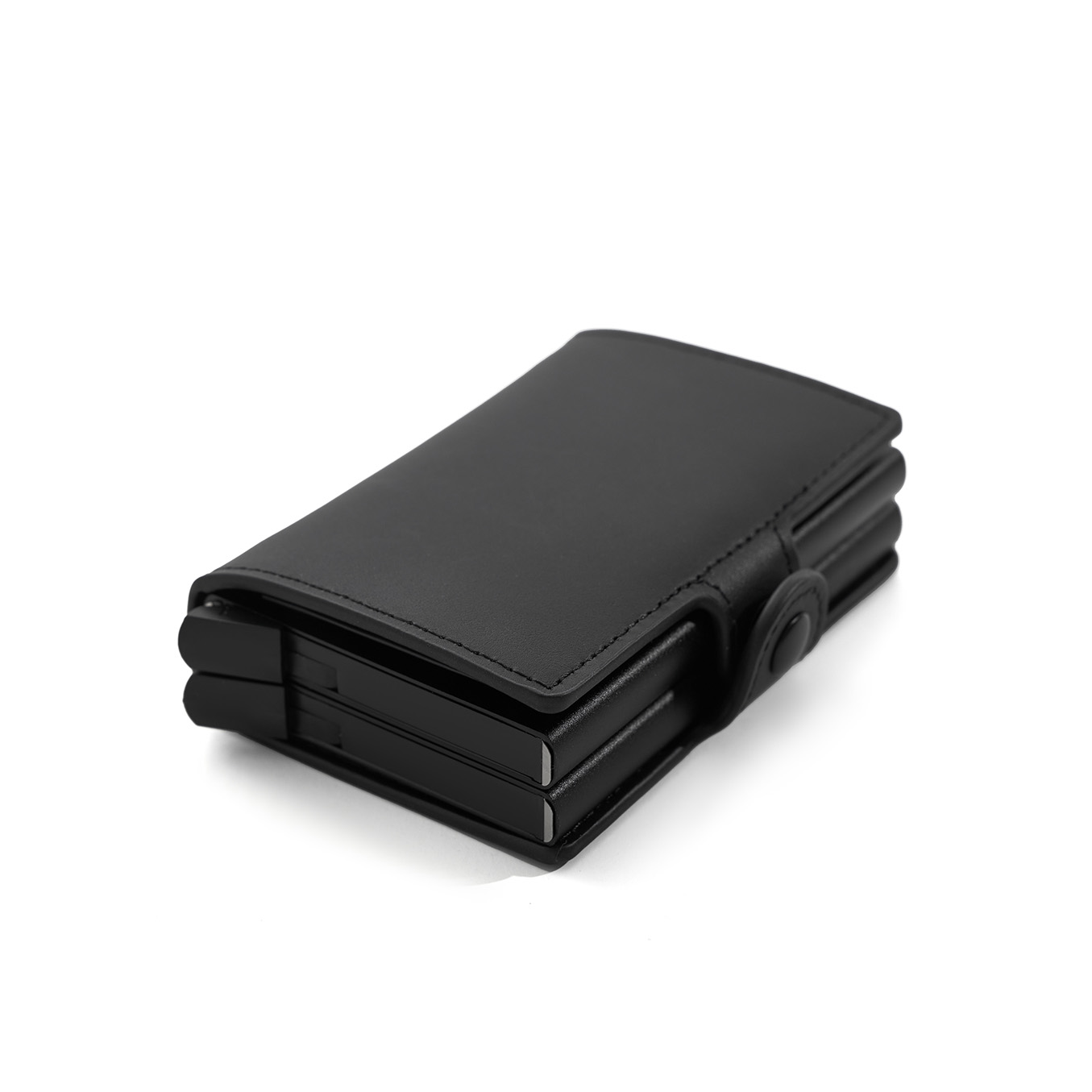 Billetera de cuero vacuno matte con doble tarjetero de aluminio anodizado negro. Compacto pero con gran capacidad, este tarjetero permite guardar de manera segura gracias a su tecnología de bloqueo RFID, hasta 8 tarjetas con relieve o 12 tarjetas lisas en su interior. Las mismas se deslizan fácilmente hacia afuera y de manera escalonada para una fácil visualización. Además cuenta con un soporte plástico para llevar un par de billetes plegados y dos bolsillos interiores para guardar 2-4 tarjetas adicionales. La billetera se cierra mediante un broche snap metálico en uno de sus laterales. Viene presentado en una caja de regalo de lujo.