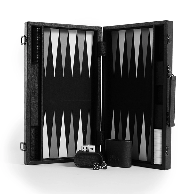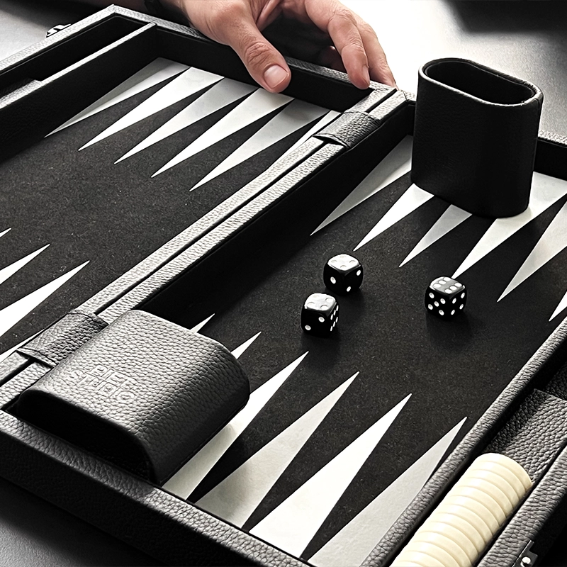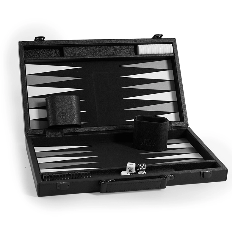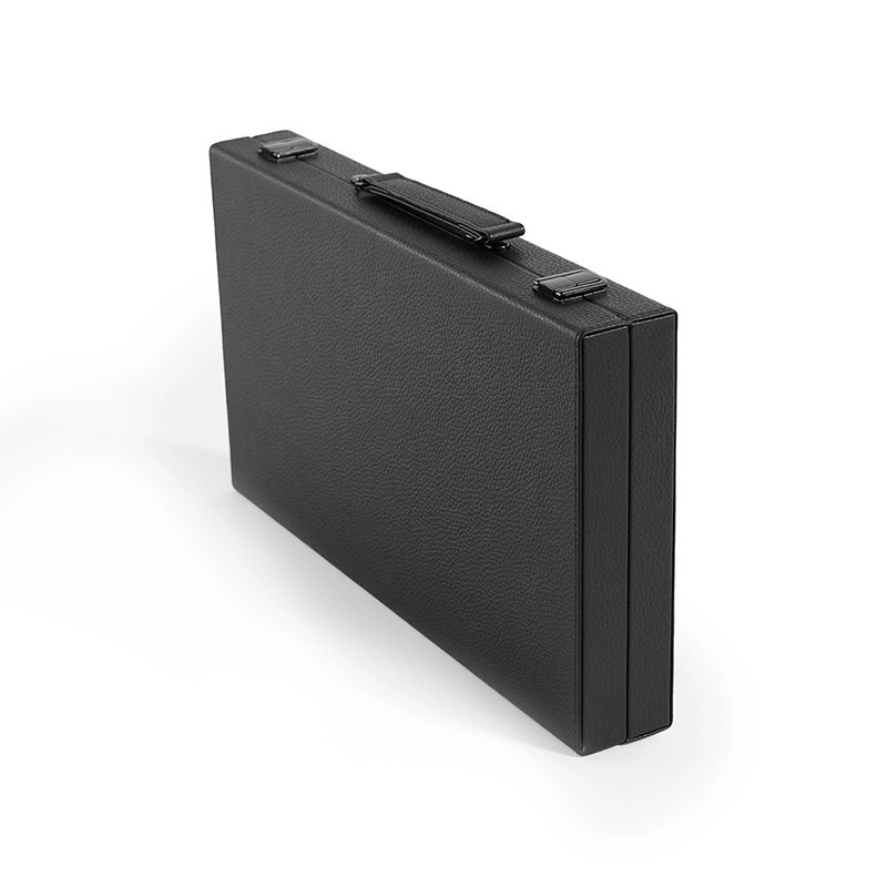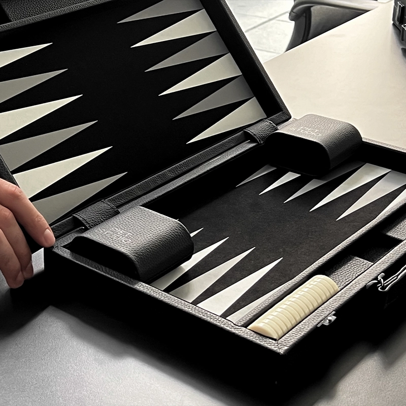 Juego de backgamon de lujo en formato maletín plegable de 15» – El tamaño perfecto para exhibir en el living de tu casa o llevar a todos lados con vos. Montado en una estructura de madera forrada en cuero vacuno graneado, herrajes metálicos negros, dados y fichas de 27 mms. de acrílico. Llevamos el juego a otro nivel.