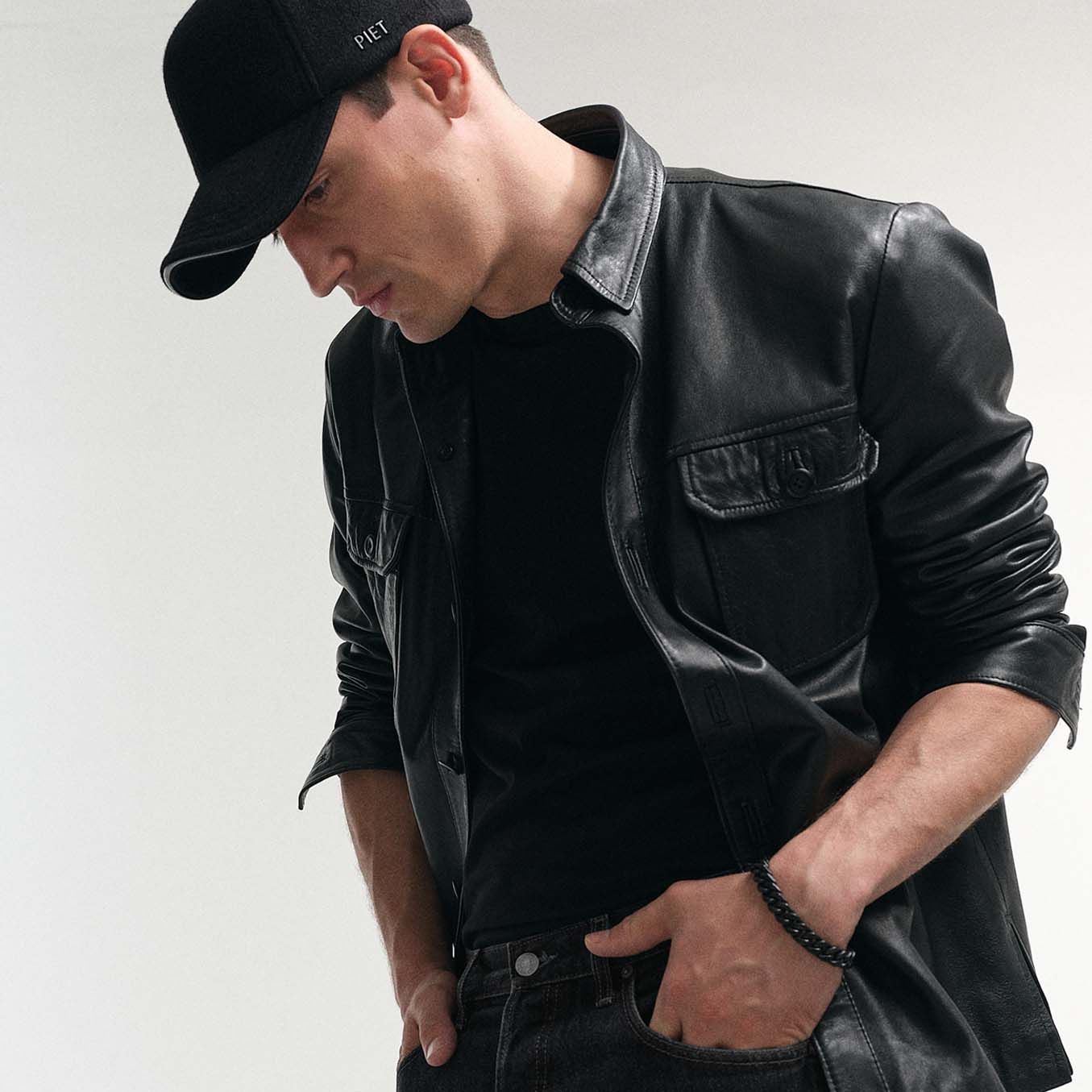 Campera realizada en cuero liso de oveja y forrada en una suave tela de algodón. Formato tipo camisa con bolsillos en pecho, cuello italiano, puños y ruedo de corte recto. Tiene una cartera con 6 botones de pasta negros, además de botones en bolsillos y en puños. Cuenta además con dos bolsillos ocultos en el interior de la cartera.