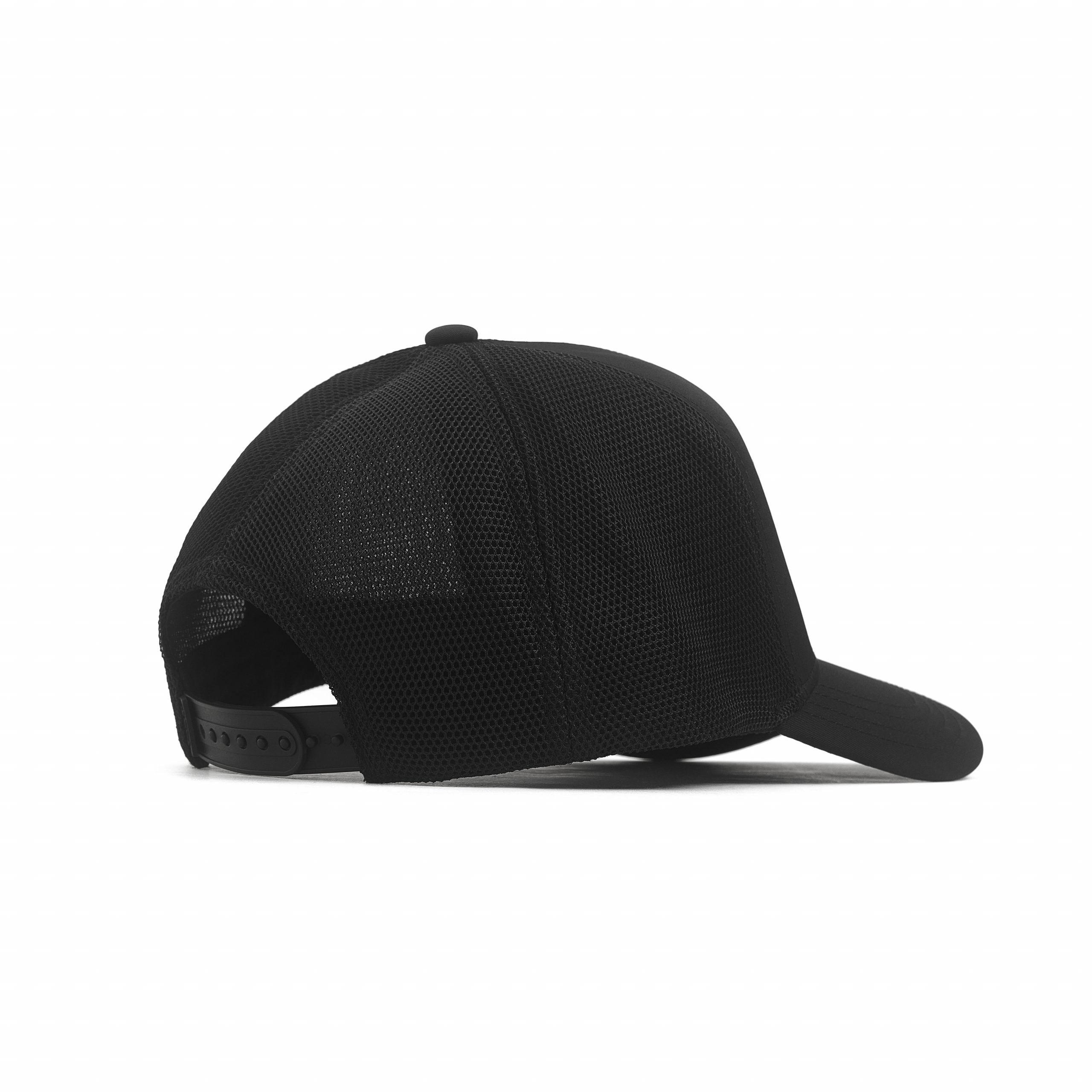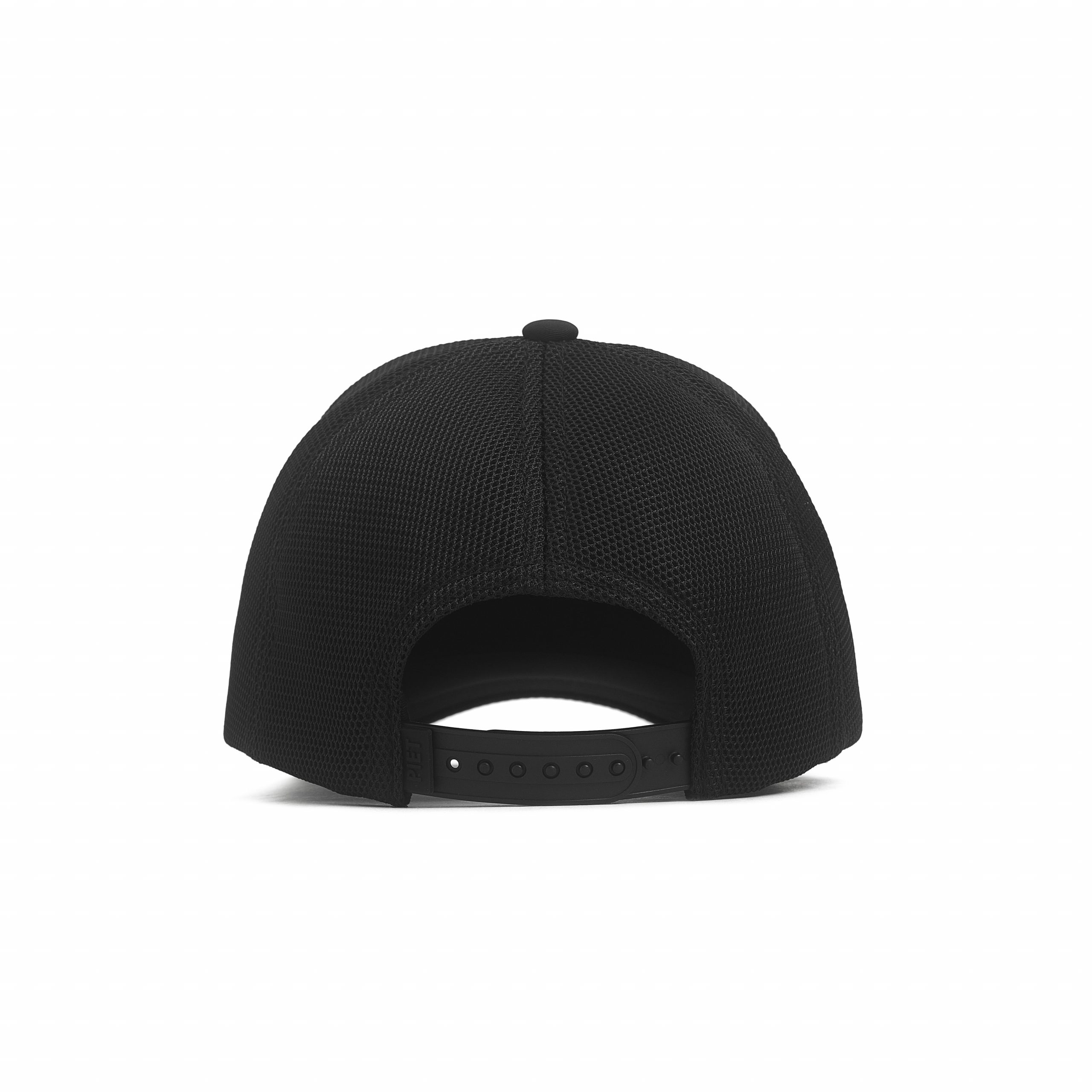 Nueva gorra con frente realizado en tejido poliéster y revés en tejido mesh premium. Clásico formato trucker de 5 gajos. Diseño de cuadrado negro bordado sobre el frente en efecto 3D. Tira trasera de plástico soft para ajustar la gorra con pequeña etiqueta de goma con logo PIET.