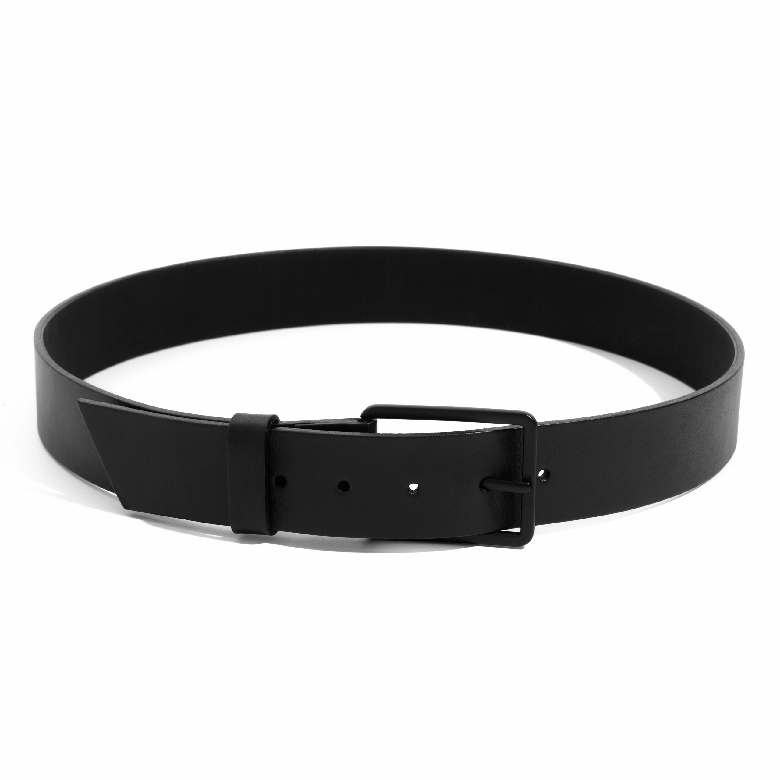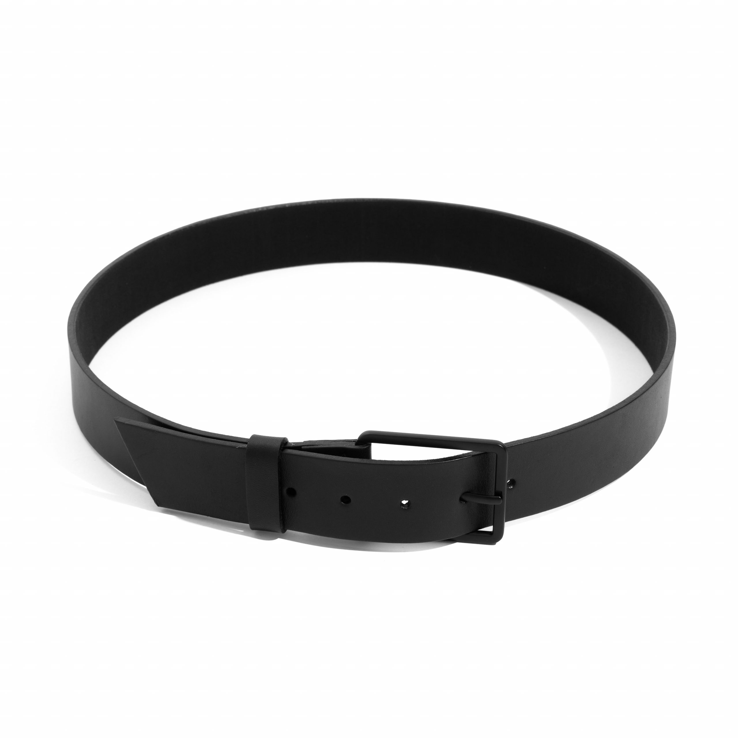 Cinturón de cuero vacuno liso de 40 mms. de ancho, con hebilla metalica negra y detalle de puntera en corte diagonal.