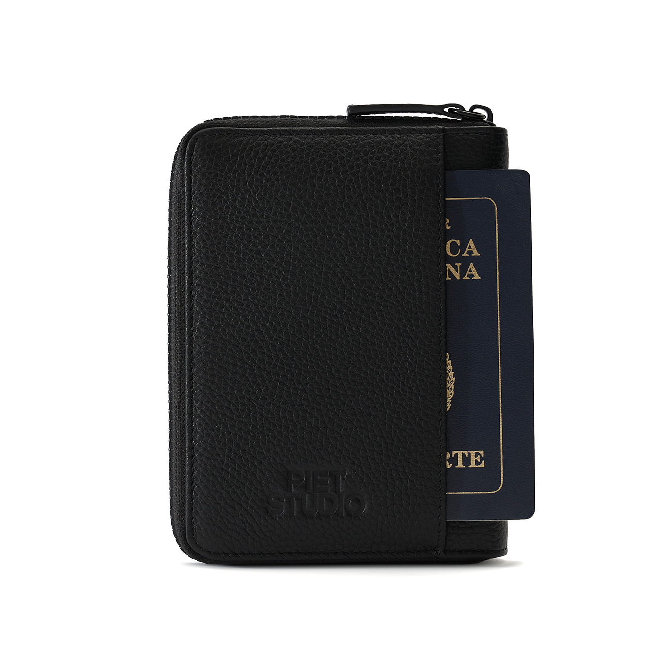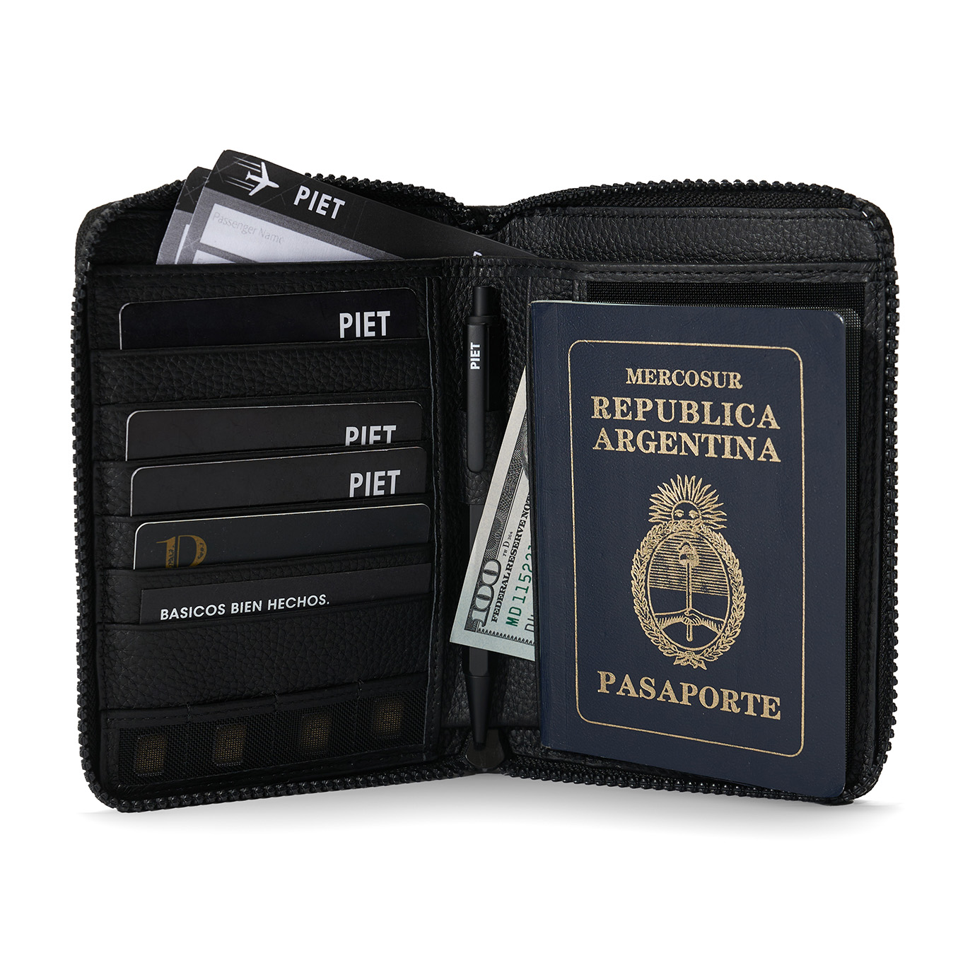 Porta pasaporte individual realizado en cuero vacuno graneado con cierre perimetral plástico y protección RFID. Cuenta con bolsillos para llevar billetes, pasajes, tarjetas, papeles y lapicera todo en un mismo lugar.