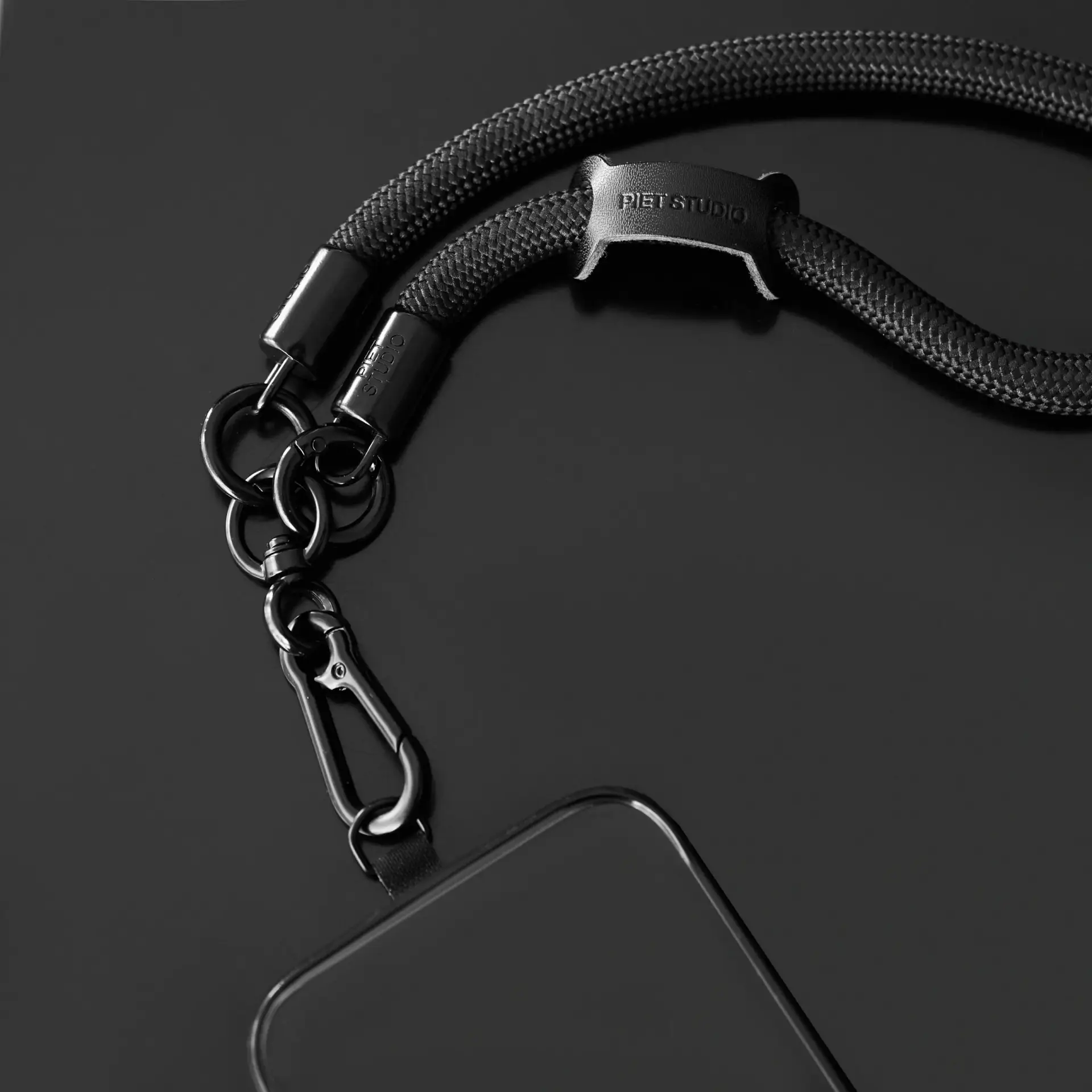 Nuevo accesorio para llevar tu celular en tu muñeca de manera cómoda y segura. Realizado en soga de nylon negra de 10 mms. de diámetro, con mosquetones metálicos negros personalizados con logo PIET STUDIO. Cuenta con un soporte universal para encajar dentro de la funda de tu celular.