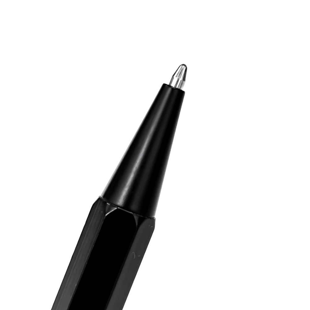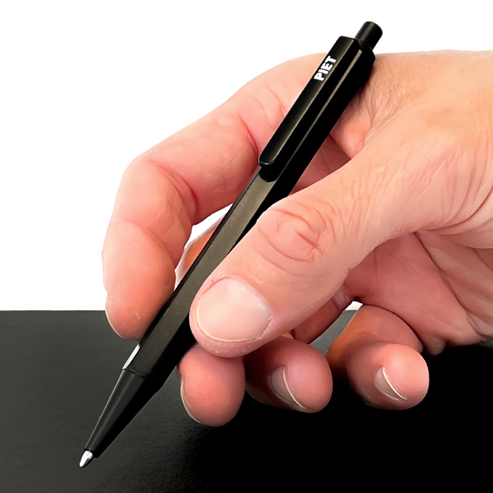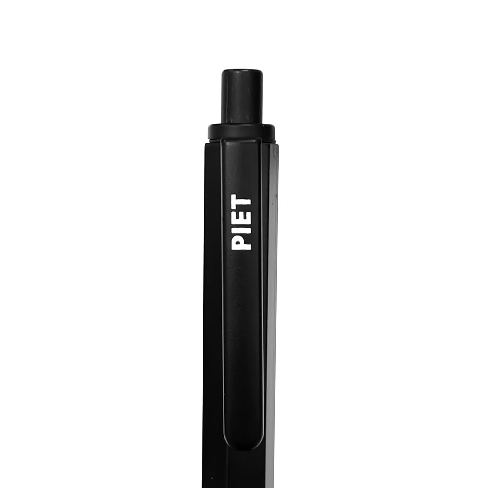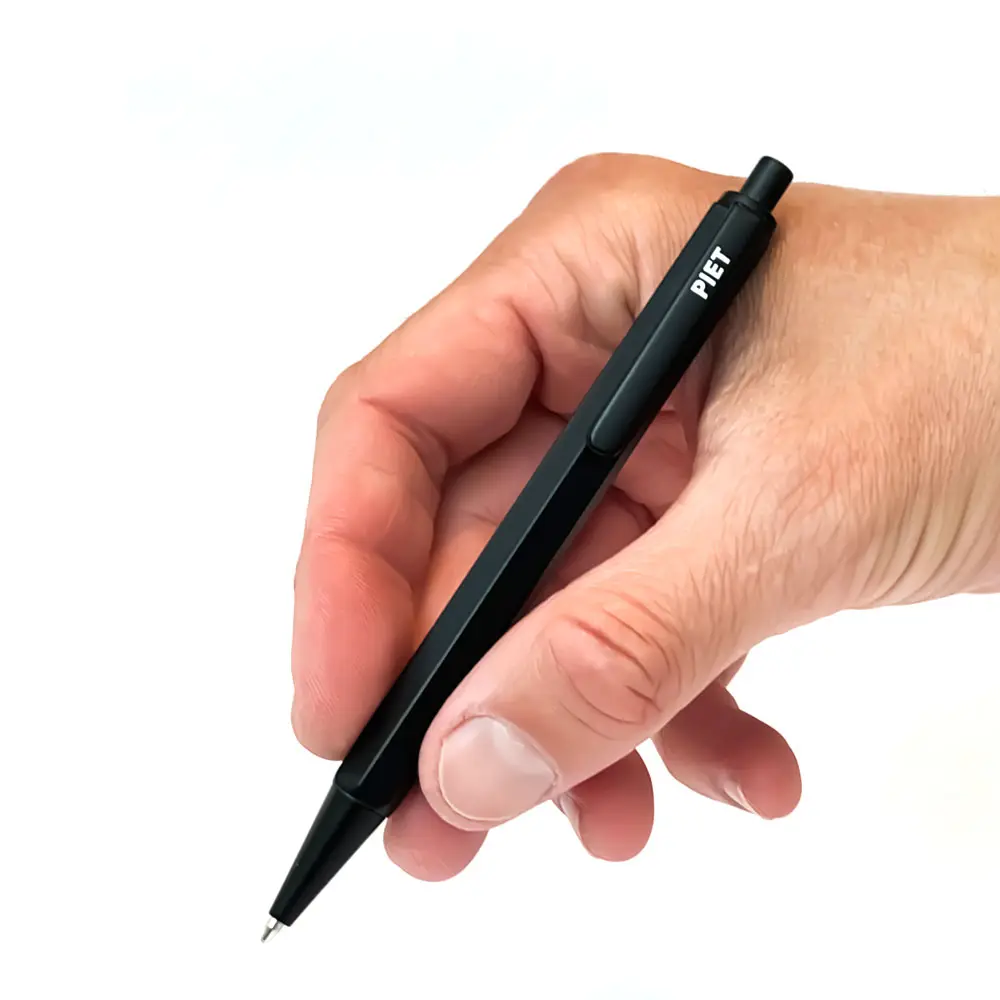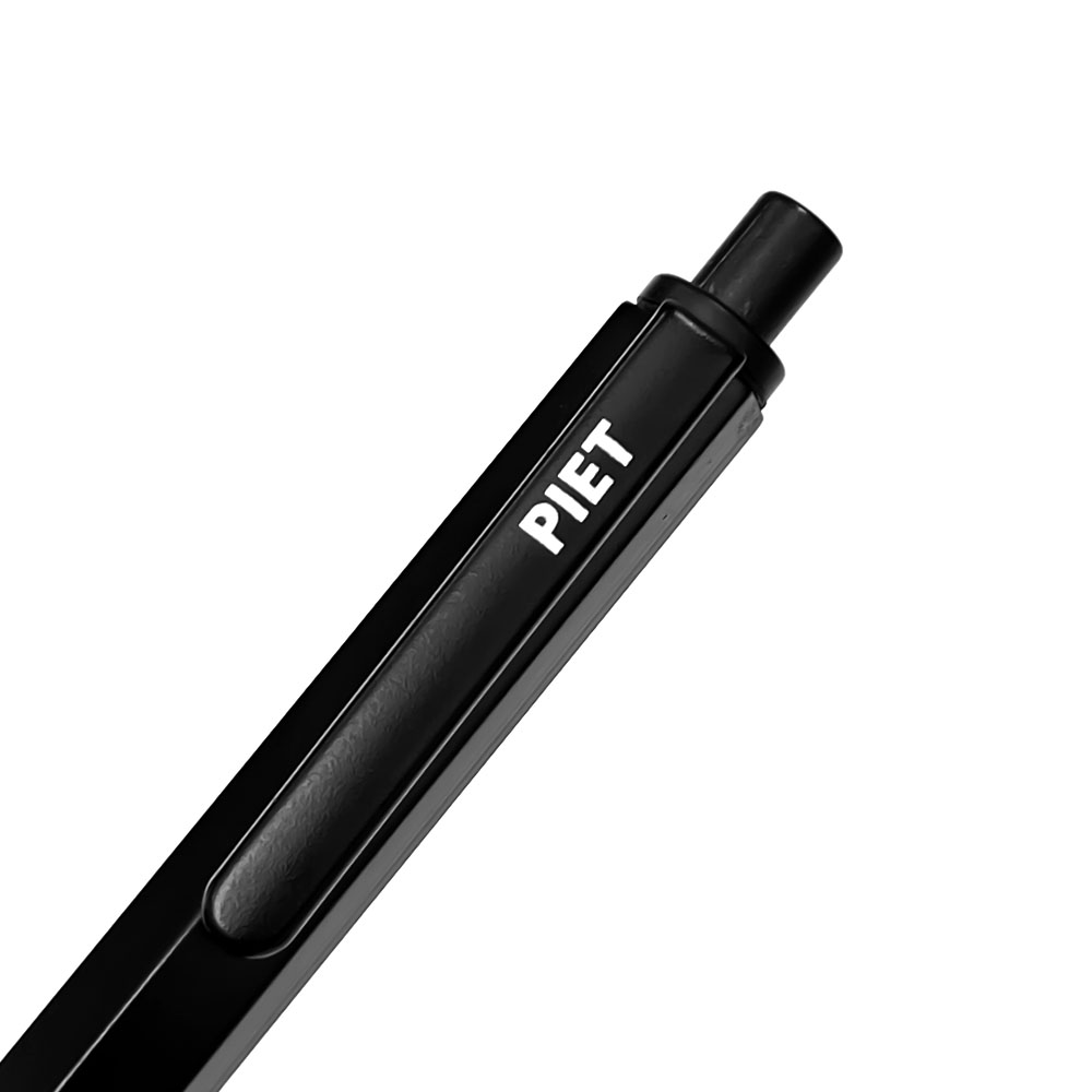 Nueva lapicera tipo bolígrafo de diseño compacto. Realizada en un metal ligero de formato hexagonal y recubierto de esmalte negro satinado y con el detalle del logo PIET en blanco serigrafiado sobre el clip. Cuenta con un mecanismo accionado por pulsador. La puntera es con bolilla metálica de trazo medio (1.0 mm) y de tinta color negro.