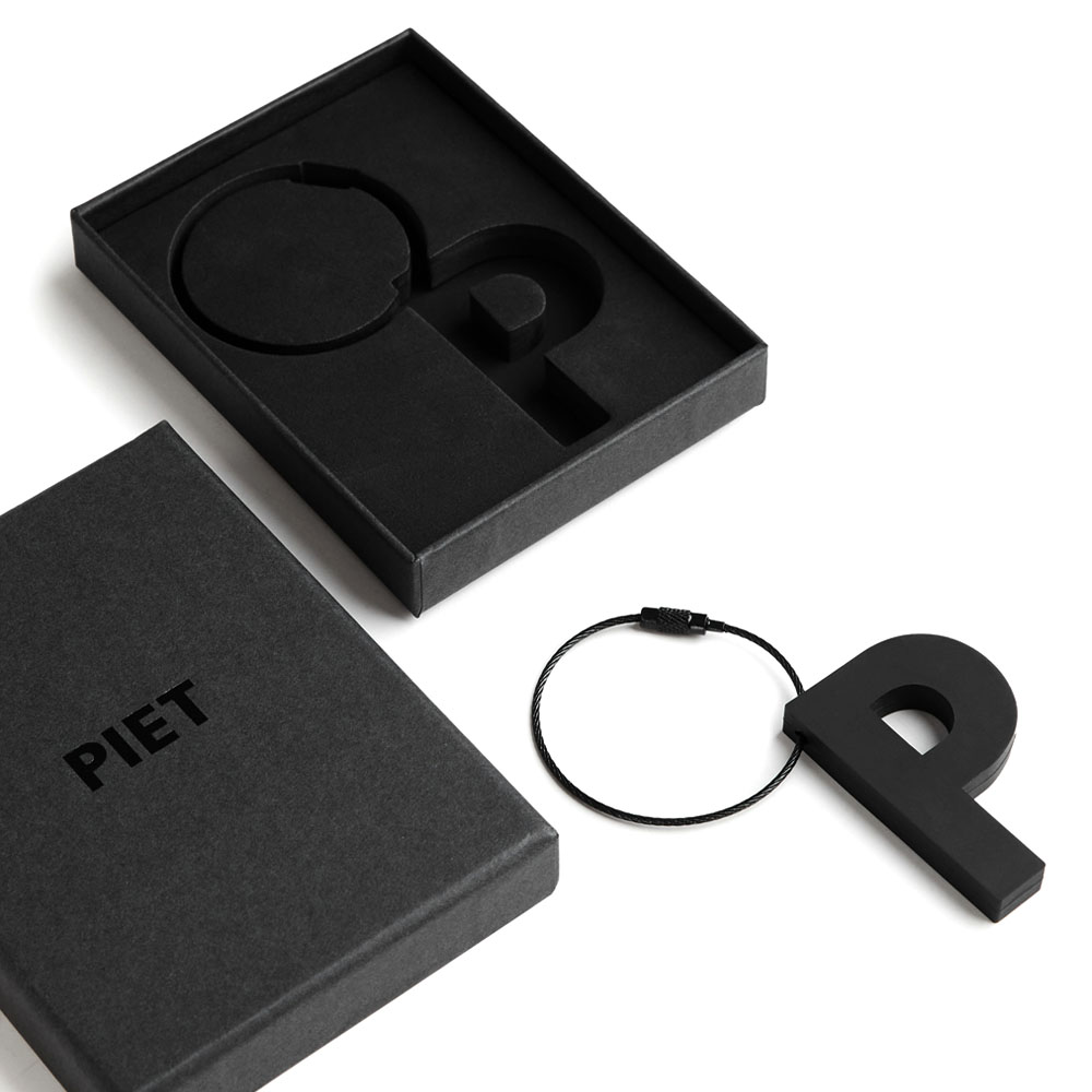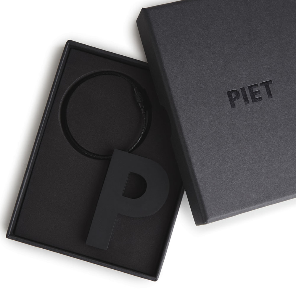 Llavero de goma «P» el complemento perfecto para llevar todas tus llaves en un mismo lugar. Cuenta con un cable metálico negro con cierre a rosca. Logo PIET® grabado en bajo relieve sobre el revés. Viene presentado en una caja de regalo de lujo.