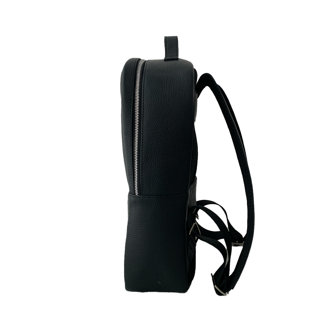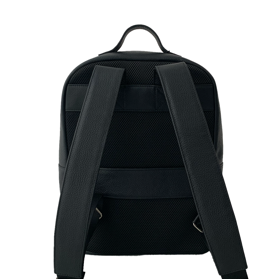 Mochila de cuero graneado con correas de cuero acolchadas y ajustables. Cierres plásticos negros «Bold Black», tiradores de cuero, y avíos metálicos en baño negro. Diseño slim con interior forrado en tela de algodón con bolsillo con cierre y dos espacios para llevar billetera y celular. Bolsillo frontal independiente con cierre plástico negro. Ahora viene con sistema de Carry-on parar llevar en equipajes.