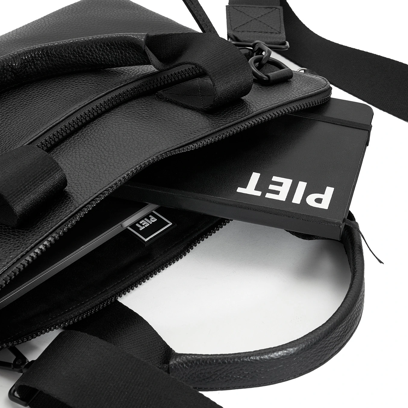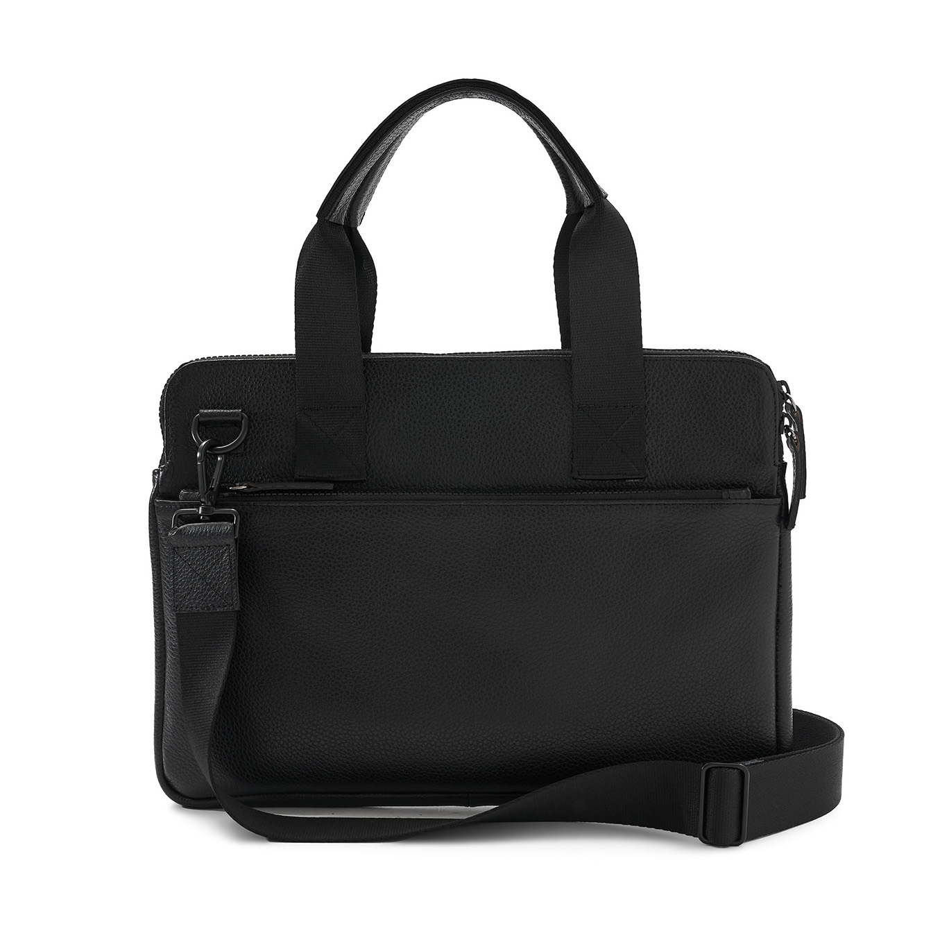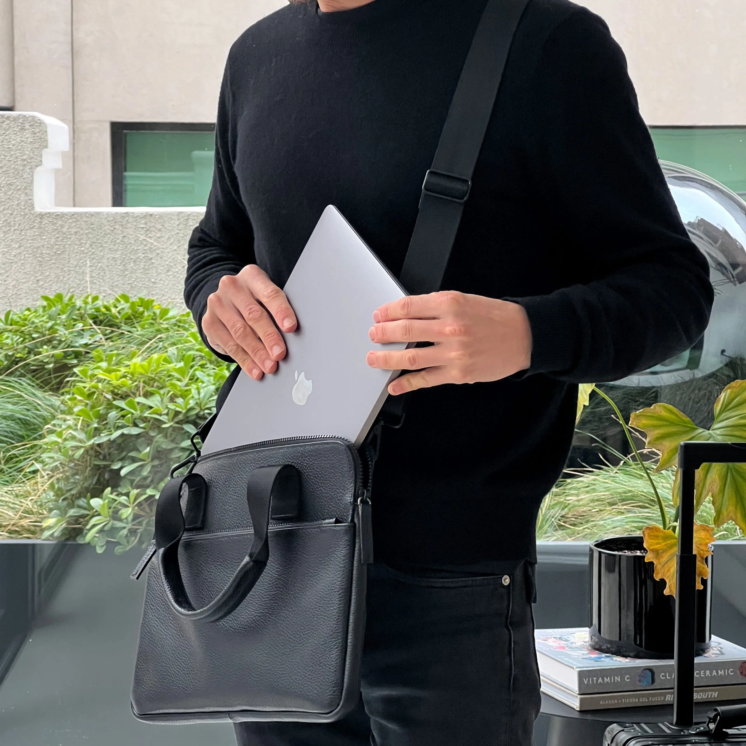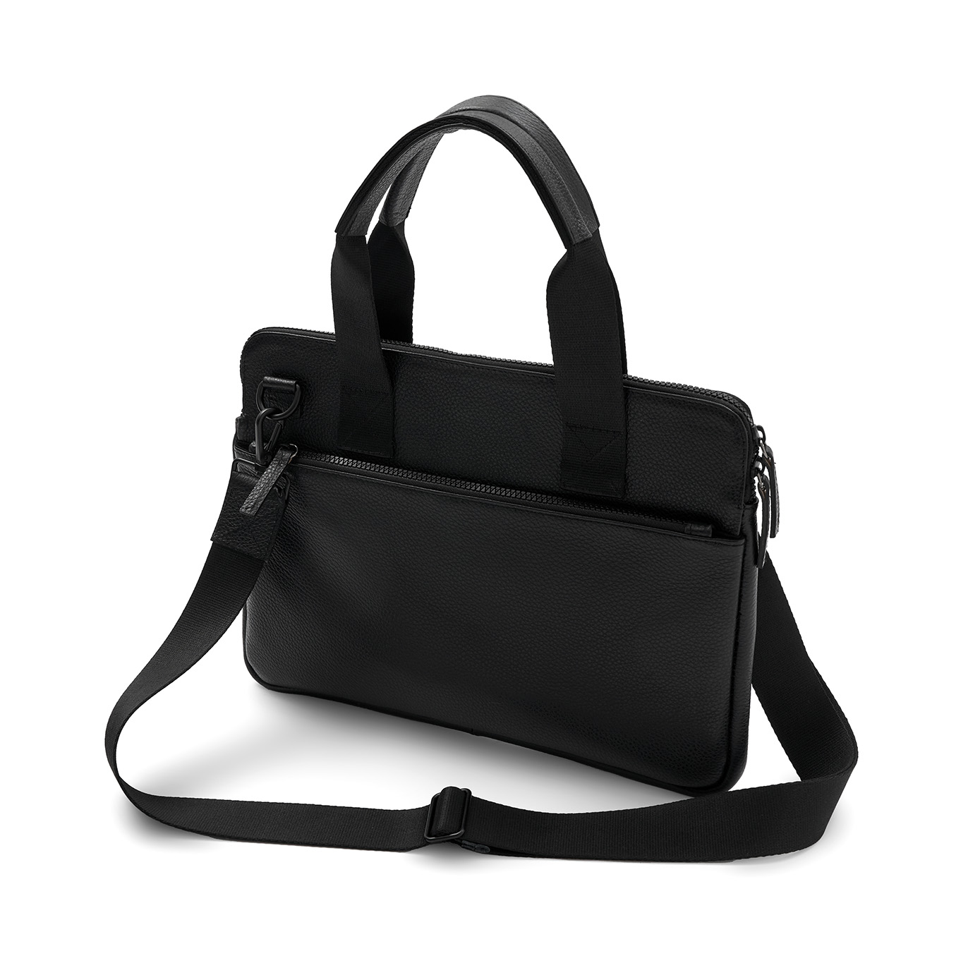 Bolso tipo maletín ultra plano realizado en cuero vacuno graneado con manijas y correa ajustable y demontable.