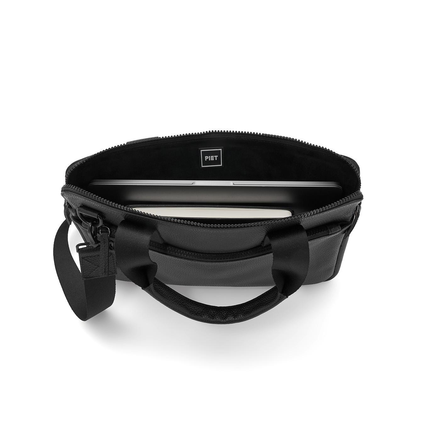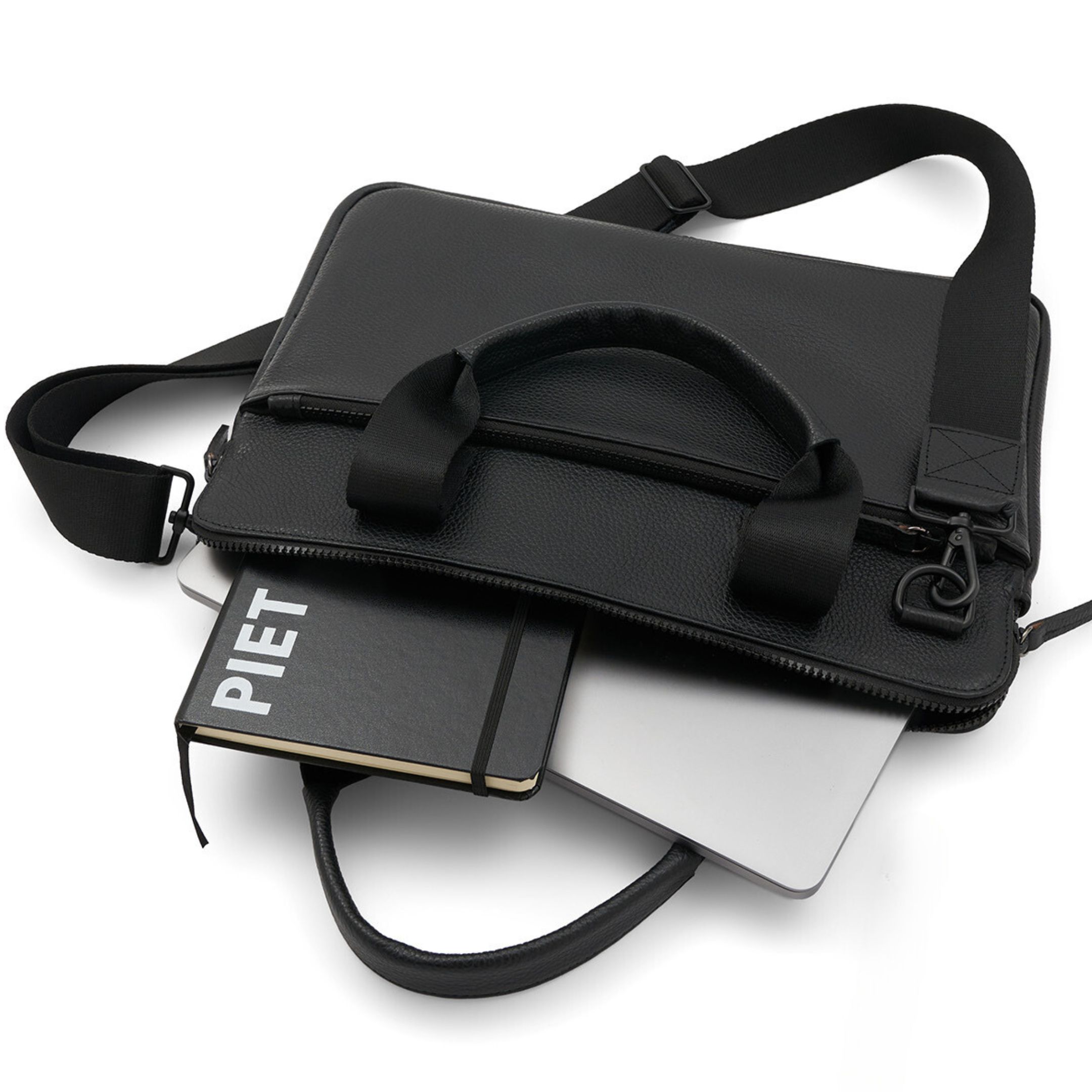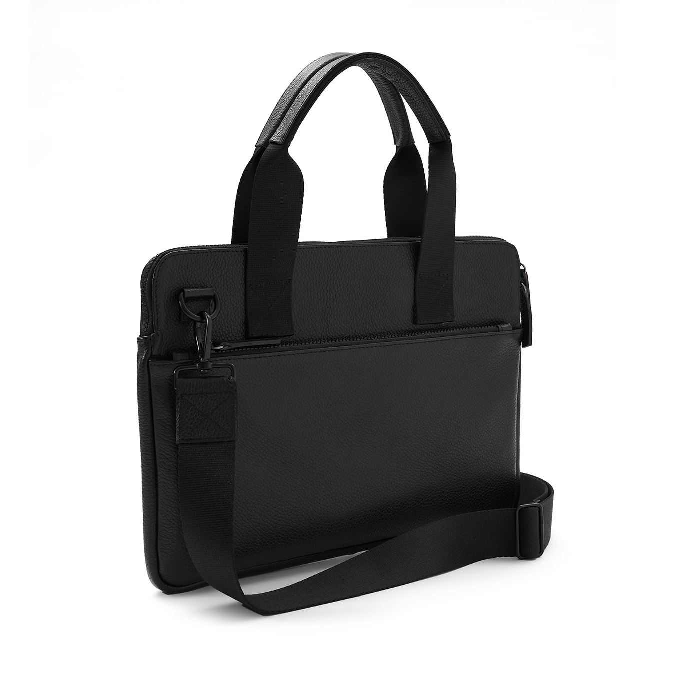 Nuevo bolso tipo maletín realizado en cuero vacuno graneado. De formato plano «ultra slim» es el accesorio ideal para llevar laptops de hasta 14.3» a la oficina, reuniones o inlusive en viajes de negocios gracias a su soporte para Carry-On. Cuenta con manijas realizadas en cinta de nylon con detalles en cuero para llevar el bolso en la mano y con una correa desmontable y ajustable para llevar el bolso al hombro. Tiene un bolsillo frontal para llevar objetos pequeños – cables, cargadores, billetera, celular o lapiceras. El acceso principal está realizado con cierres plásticos Bold Black y doble tiracierre. El interior está forrado en una suave microfibra esmerilada y cuenta con un bolsillo plano. Verificá las medidas de tu laptop con las dimensiones del producto.