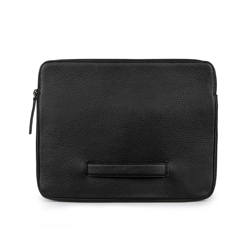 Estuche porta laptop de hasta 15 pulgadas realizado en cuero vacuno graneado.