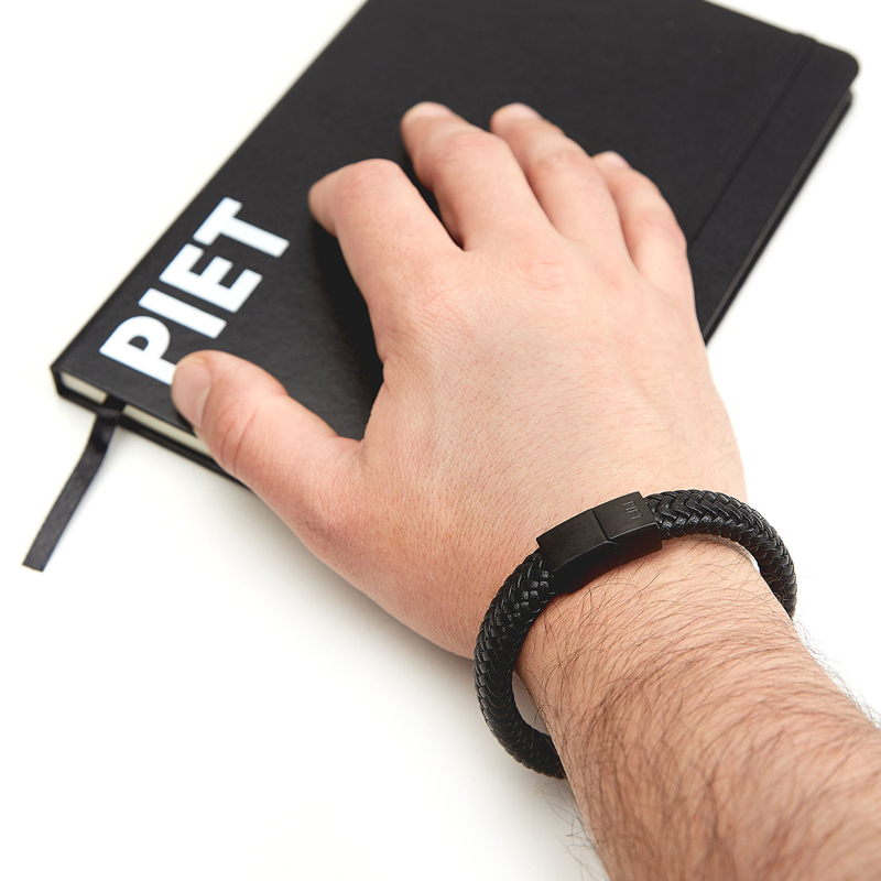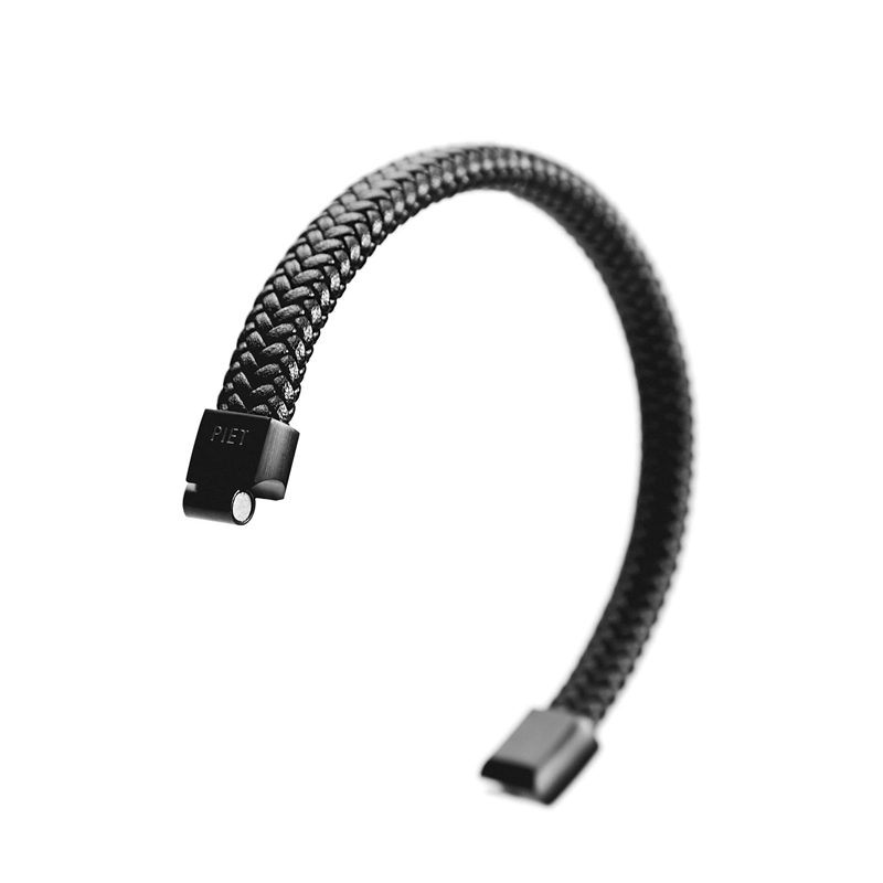 Pulsera de cuero vacuno doble trenzado con cierre de titanio magnético en baño negro matte. Logo PIET grabado en bajo relieve sobre el broche. Viene en dos medidas.