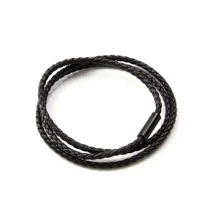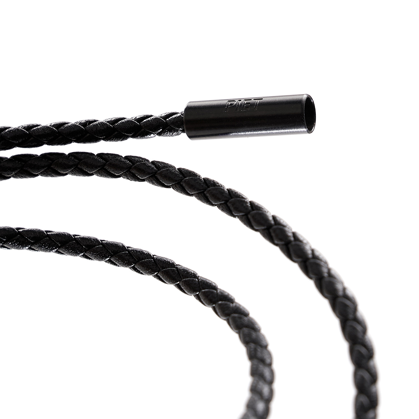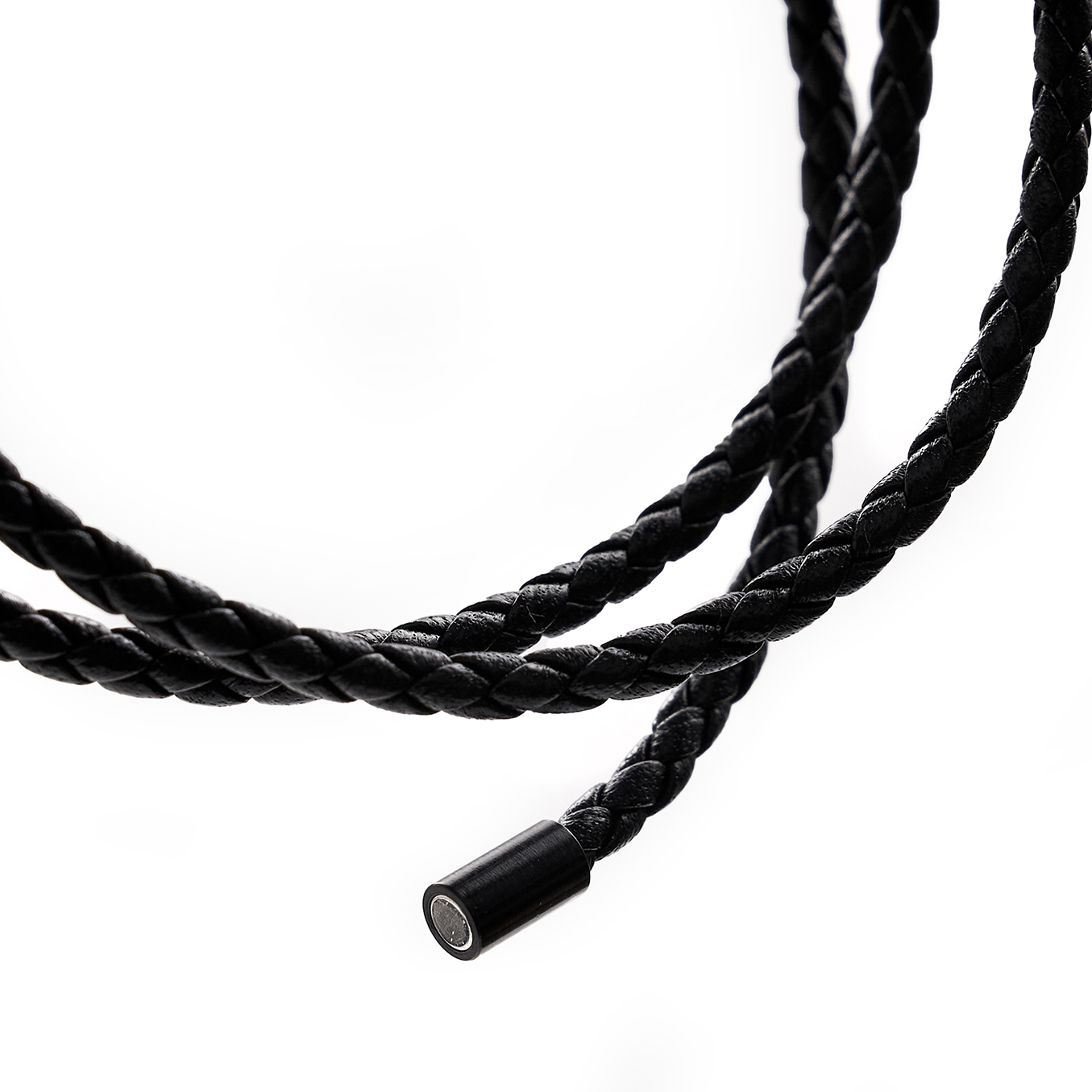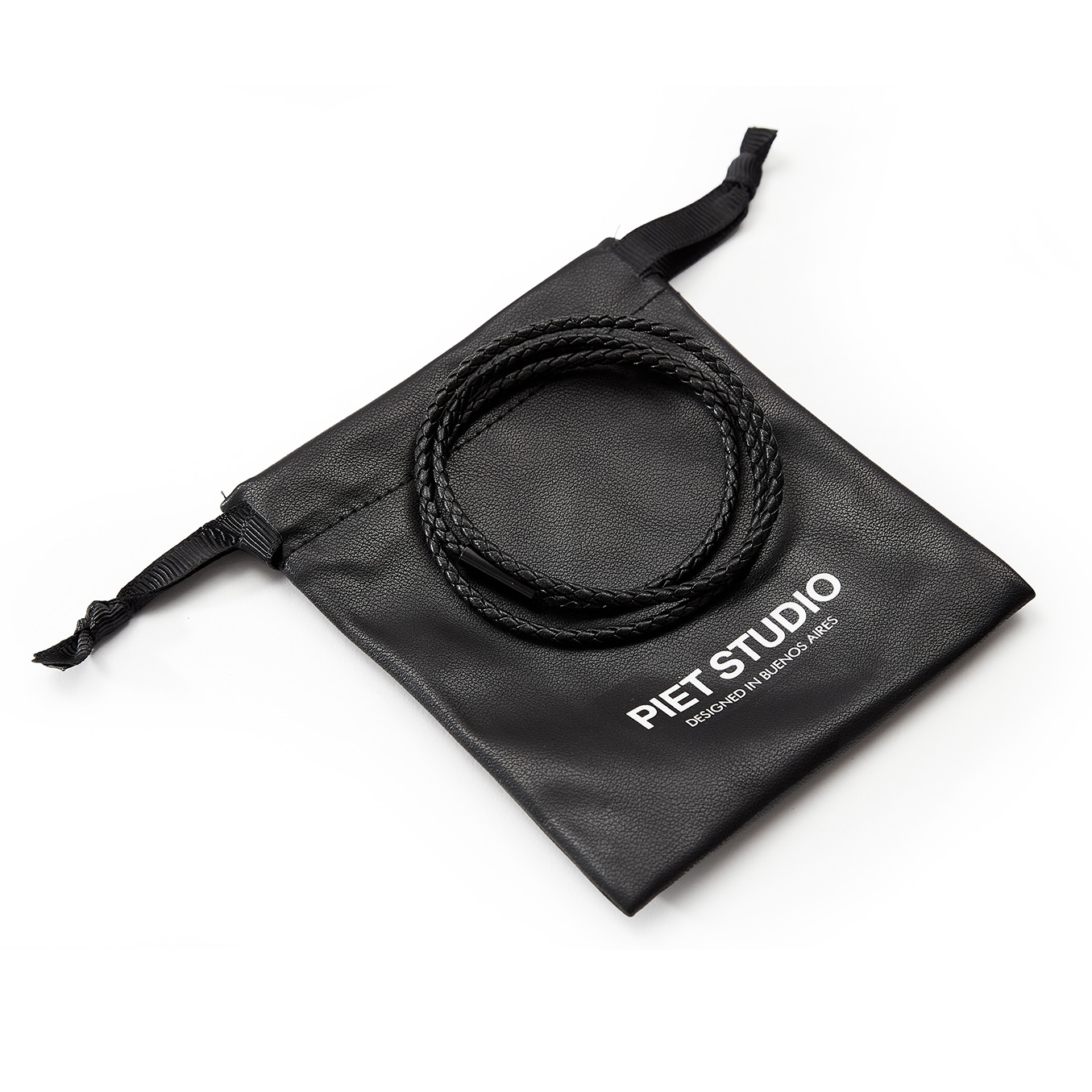 Pulsera de cuero vacuno trenzado en 3 mms de espesor y con triple vuelta para crear la ilusión de estar usando varias pulseras en simultáneo. Cuenta con una hebilla metálica tubular imantada en baño negro matte con un pequeño logo PIET grabado en bajo relieve. Viene presentada en una bolsa de PU negra con estampado de PIET STUDIO.