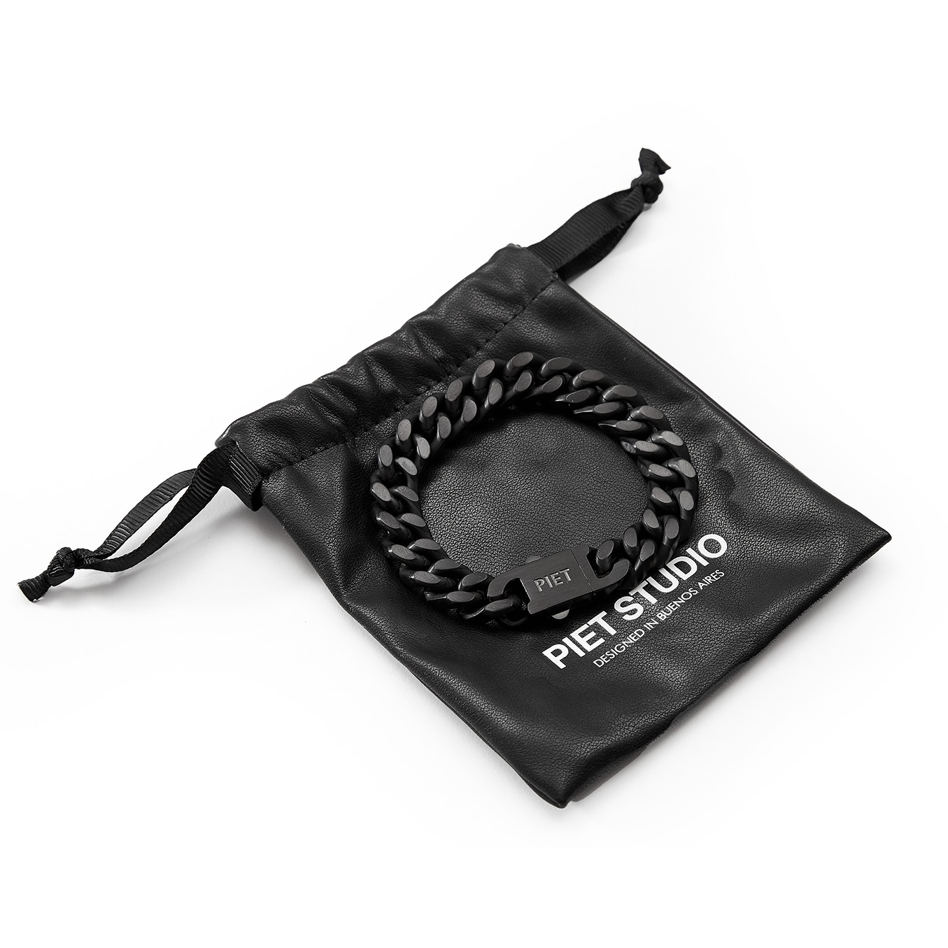 Pulseras con eslabones realizada en acero inoxidable baño negro matte. Logo PIET grabado en bajo relieve sobre el revés de la hebilla de cierre. Disponible en 2 talles.