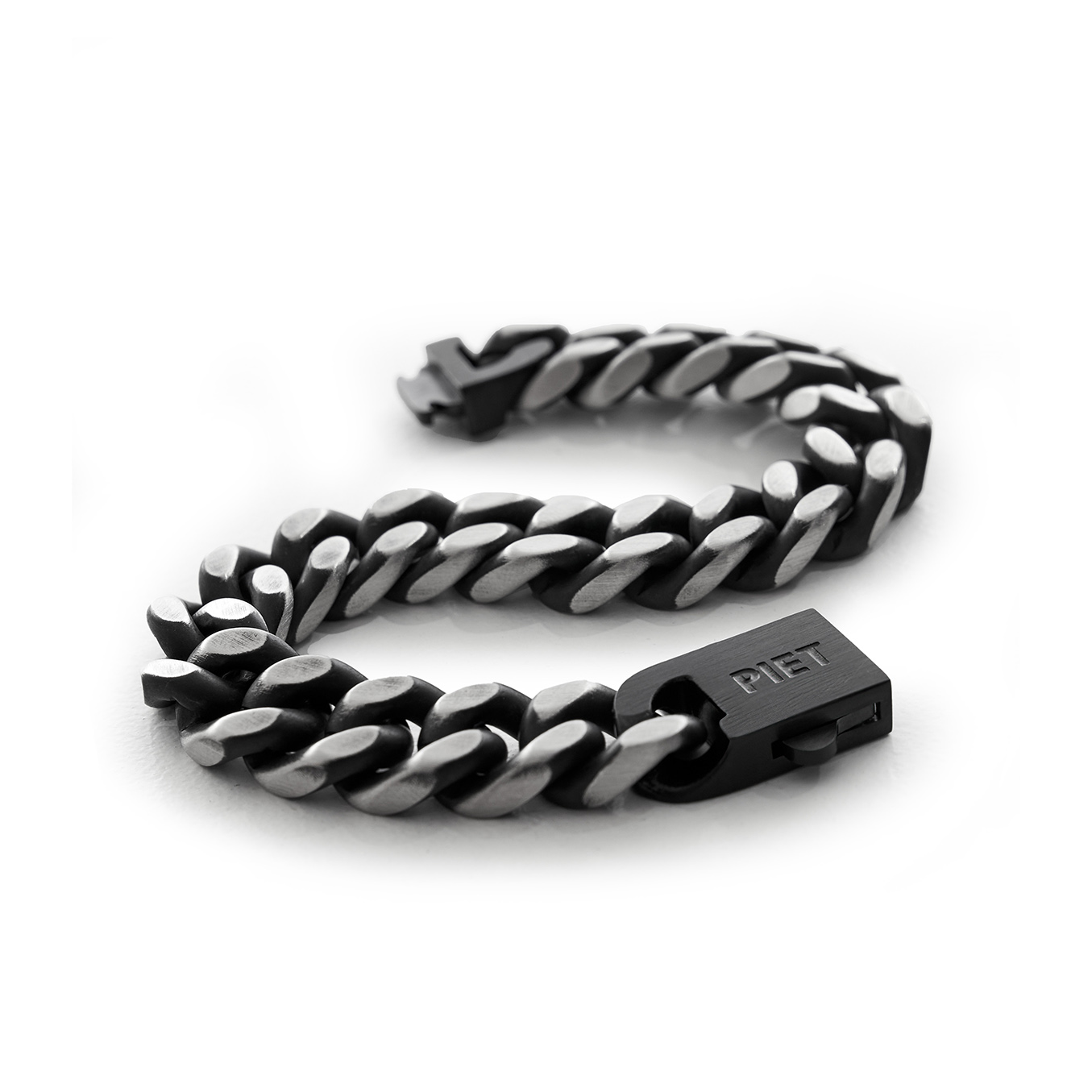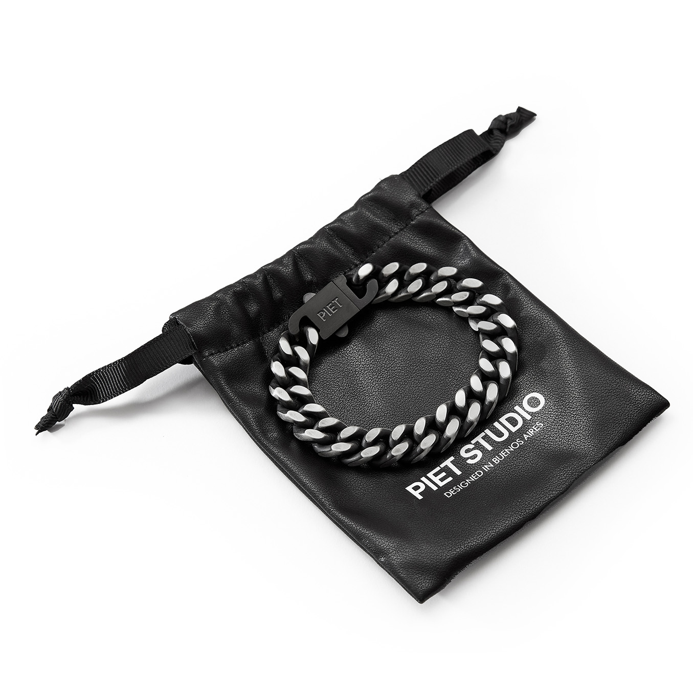Pulseras de eslabones realizada en acero inoxidable. Combina los acabados negro matte y pulido plateado. Logo PIET grabado en bajo relieve sobre el revés de la hebilla de cierre. Disponible en 2 talles.