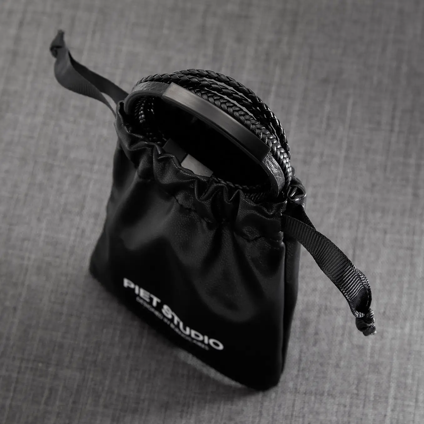 Pulsera de cuero vacuno con chapa metálica en baño negro matte. Conformada por 4 tiras de cuero de diferentes trenzados, unidas por una hebilla metálica de cierre magnético. Viene presentada en una bolsa de PU negra con estampado de PIET STUDIO. Disponible en 3 talles: