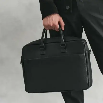 Bolso rectangular compacto tipo riñonera realizado en cuero vacuno graneado. Ideal para llevar cruzado de hombros o en la cintura.