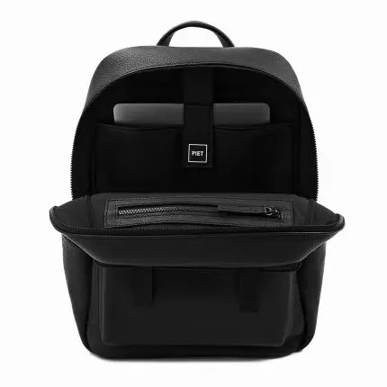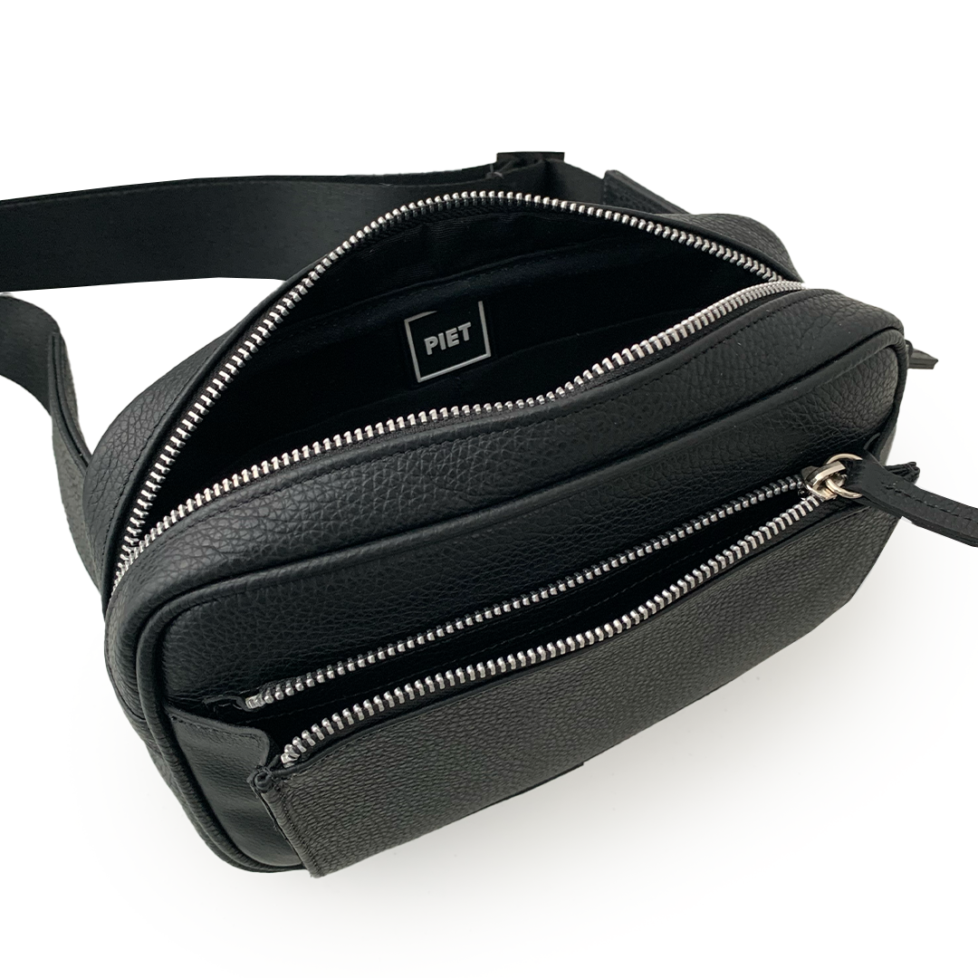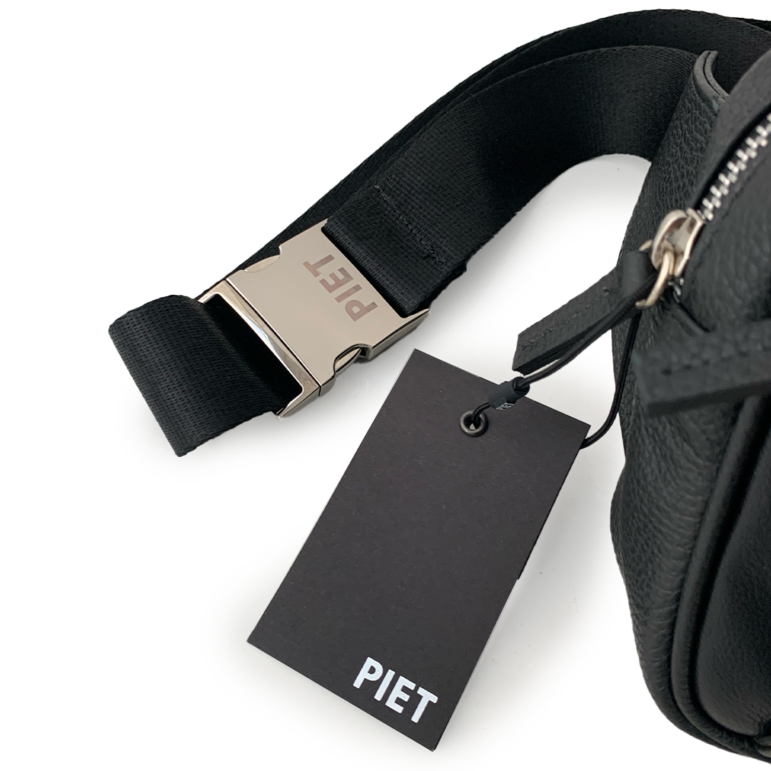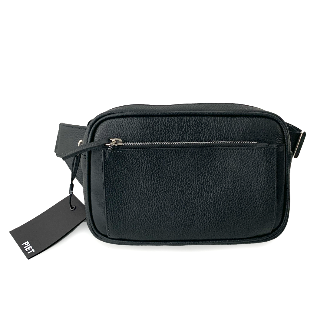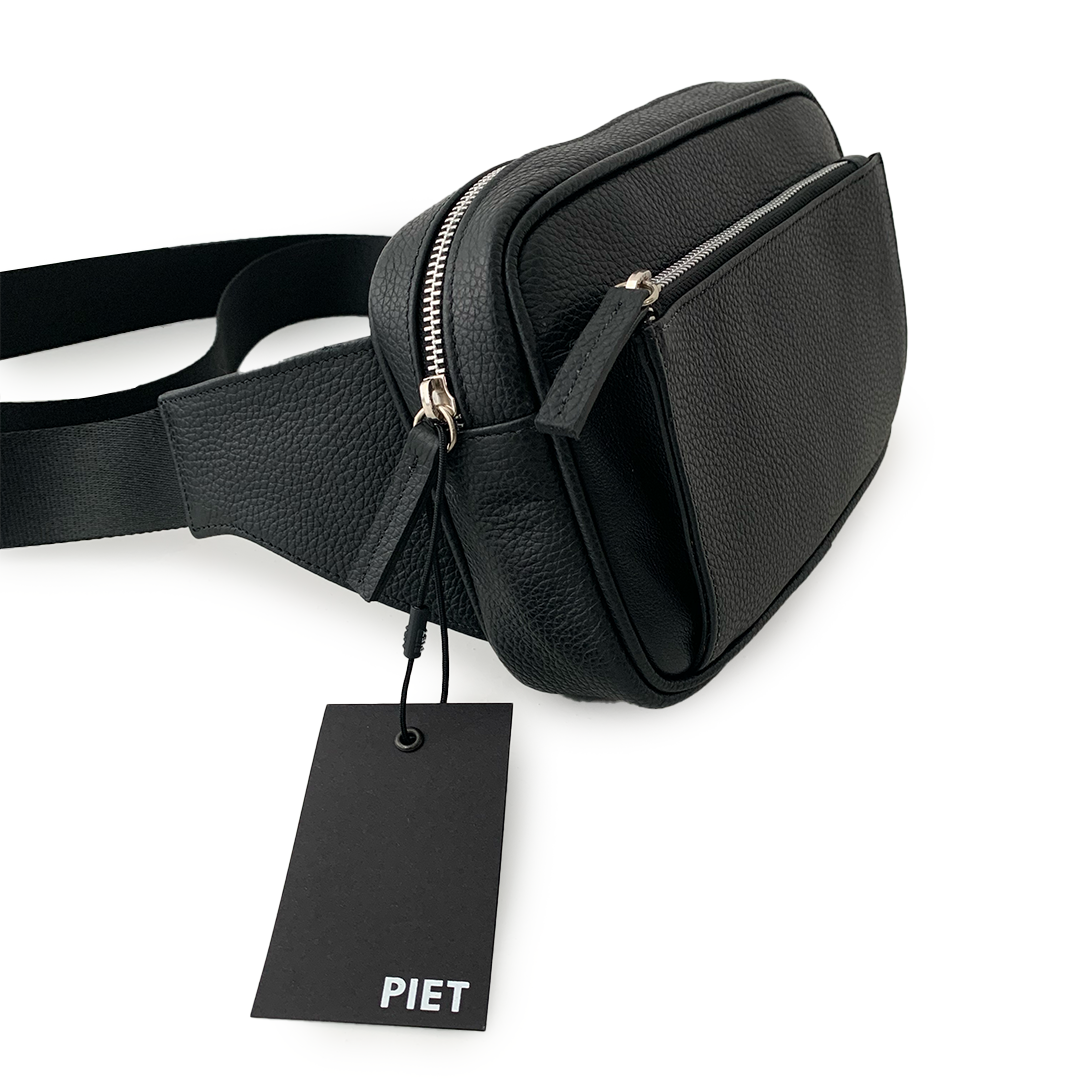 Riñonera realizada en cuero vacuno graneado con revés de tejido mesh. Acceso principal y bolsillo frontal con fuelle de cuero liso y con cierres plásticos negros ‘Bold Black’. Interior forrado en lona de algodón con bolsillos compartimentados para llevar objetos pequeños. Posee una correa de soga regulable con hebilla metálica negra con logo PIET para llevar cruzado en los hombros.
