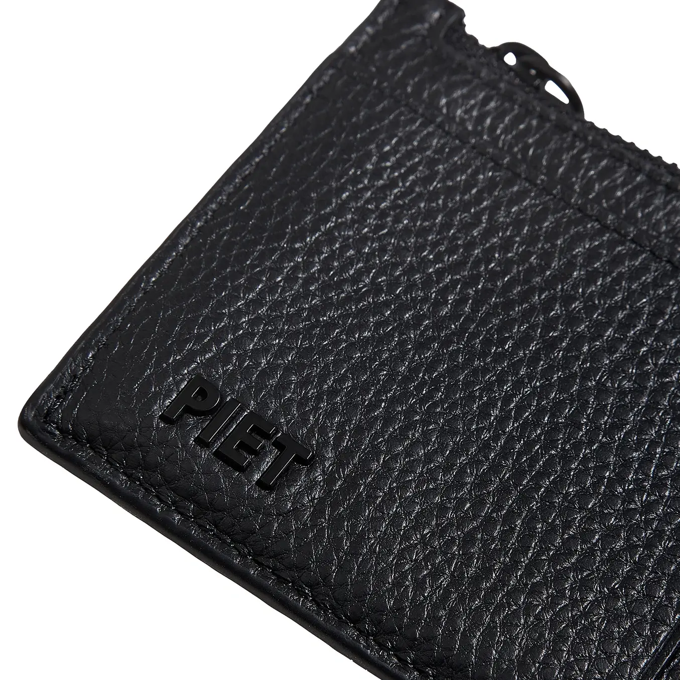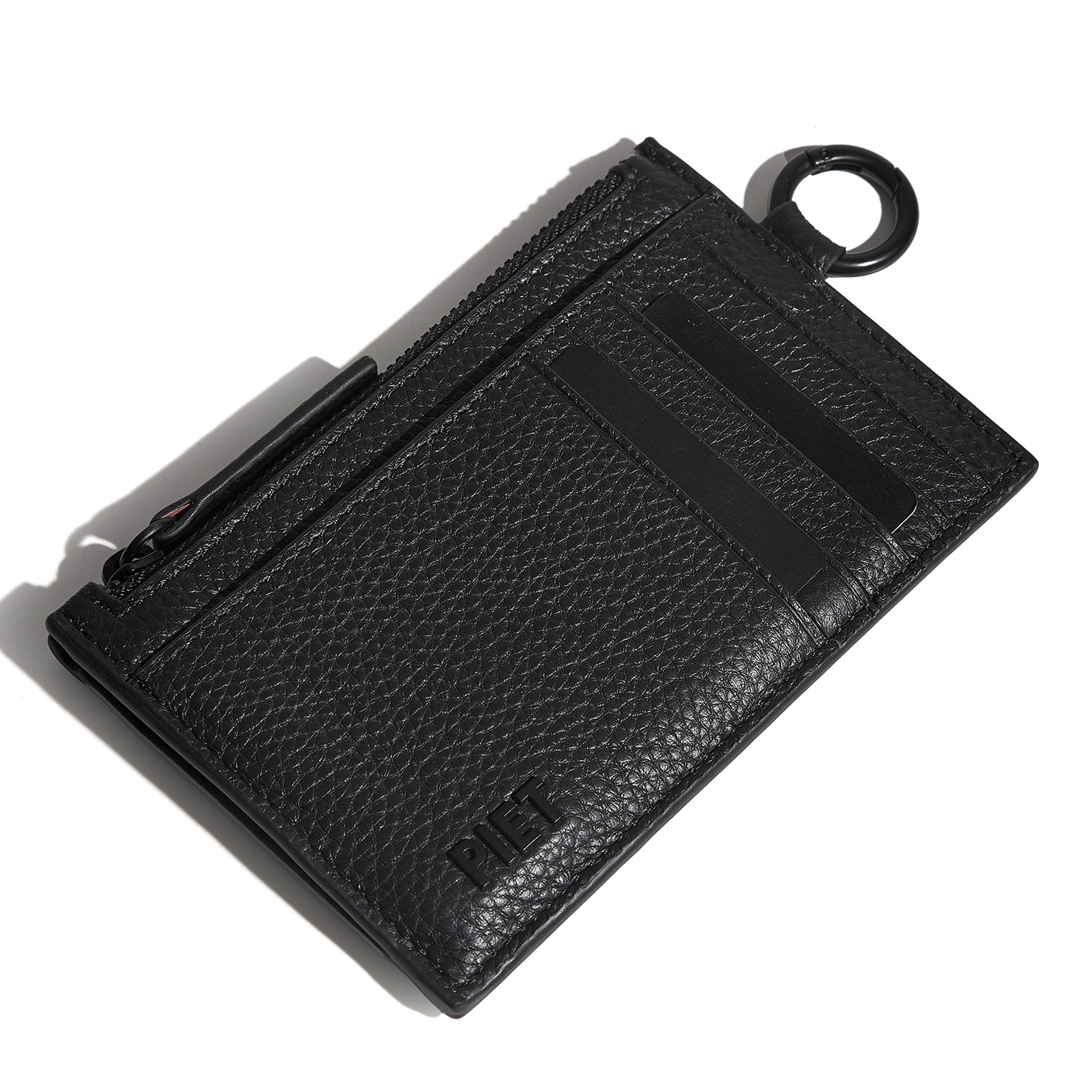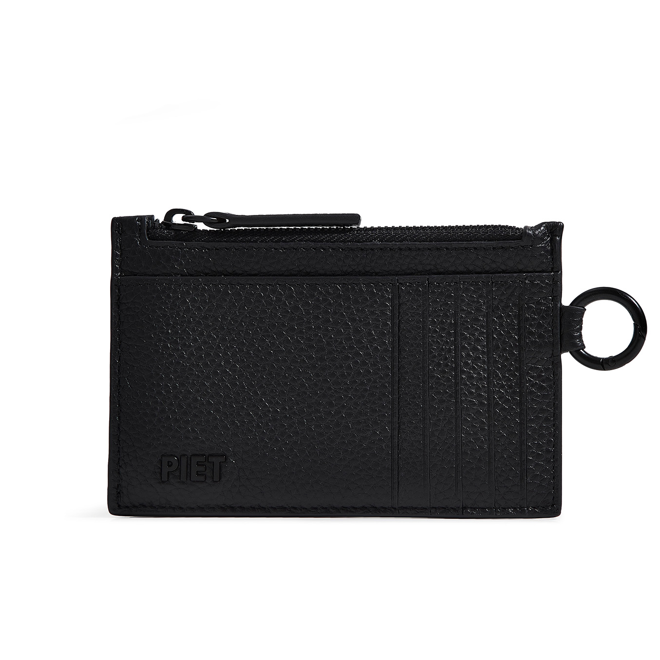 Tarjetero de cuero vacuno graneado. Pertenece a la colección de pequeños Accesorios de Lujo. Cuenta con 5 bolsillos tarjeteros flat a cada lado, para llevar cómodamente hasta 10 tarjetas. Bolsillo principal con fuelle y cierre metálico en baño negro e interior forrado en cuero liso, ideal para llevar billetes, monedas o más tarjetas. Presenta un bolsillo adicional del lado externo. Además este artículo posee un mosquetón circular negro a un lado, con protección de RFID y bordes pintados de manera artesanal con el detalle del logo PIET realizado en piezas metálicas negras.