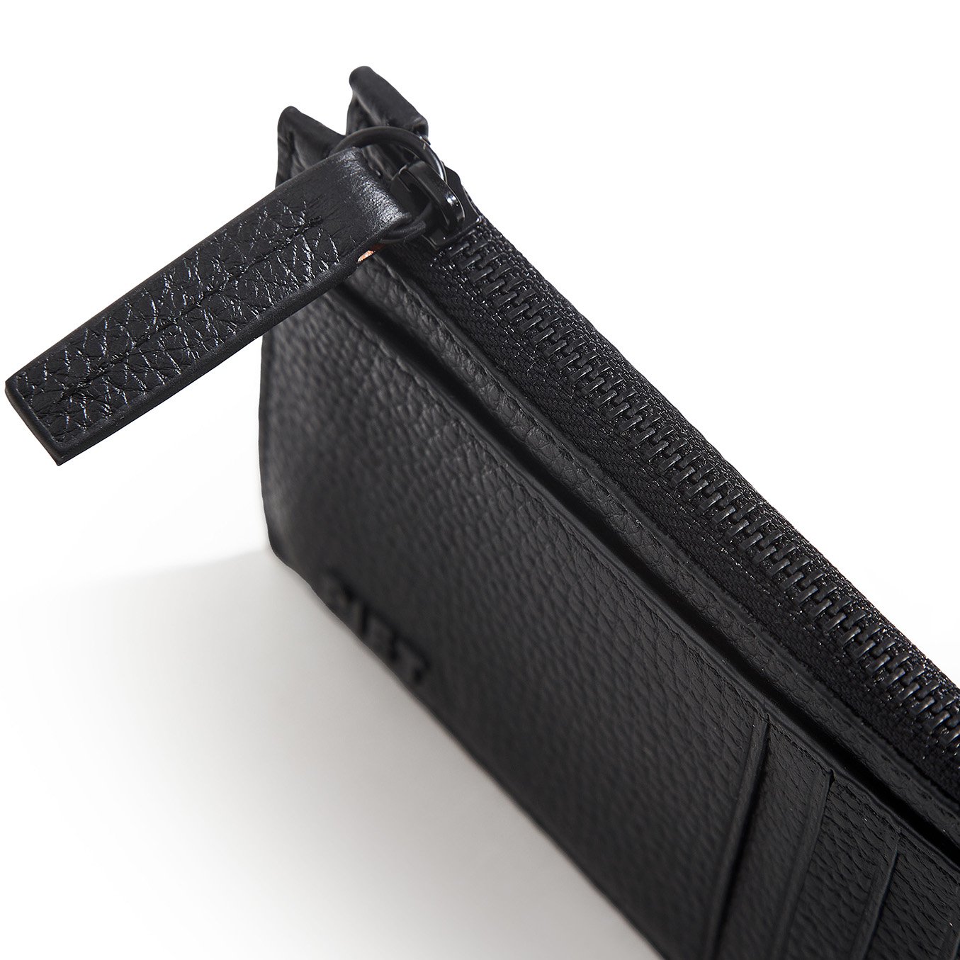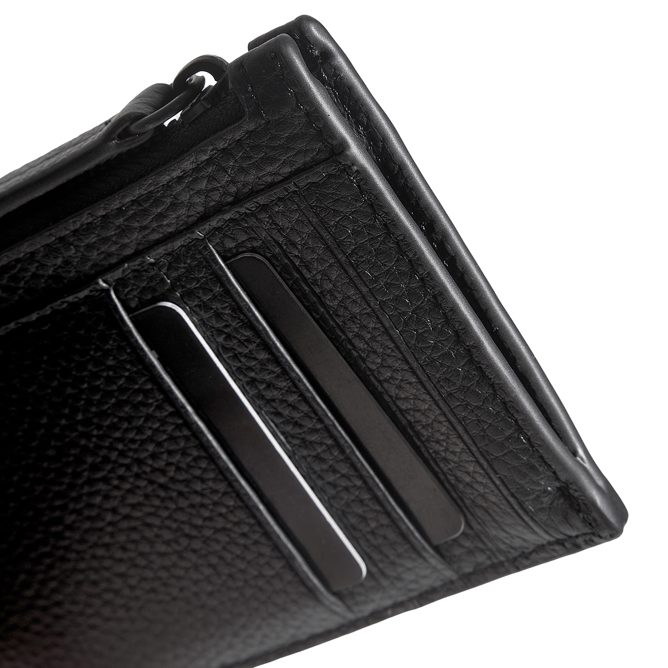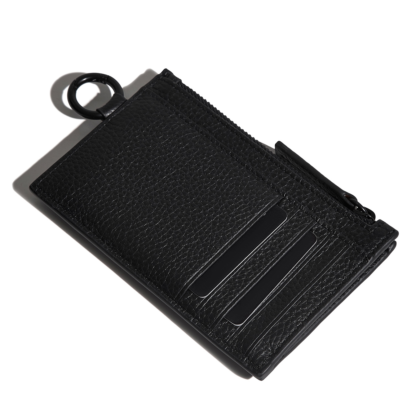 Tarjetero de cuero vacuno con cierre metálico negro. Espacio para llevar hasta 10 tarjetas y bolsillo principal para llevar billetes, monedas y más tarjetas. Con protección RFID.